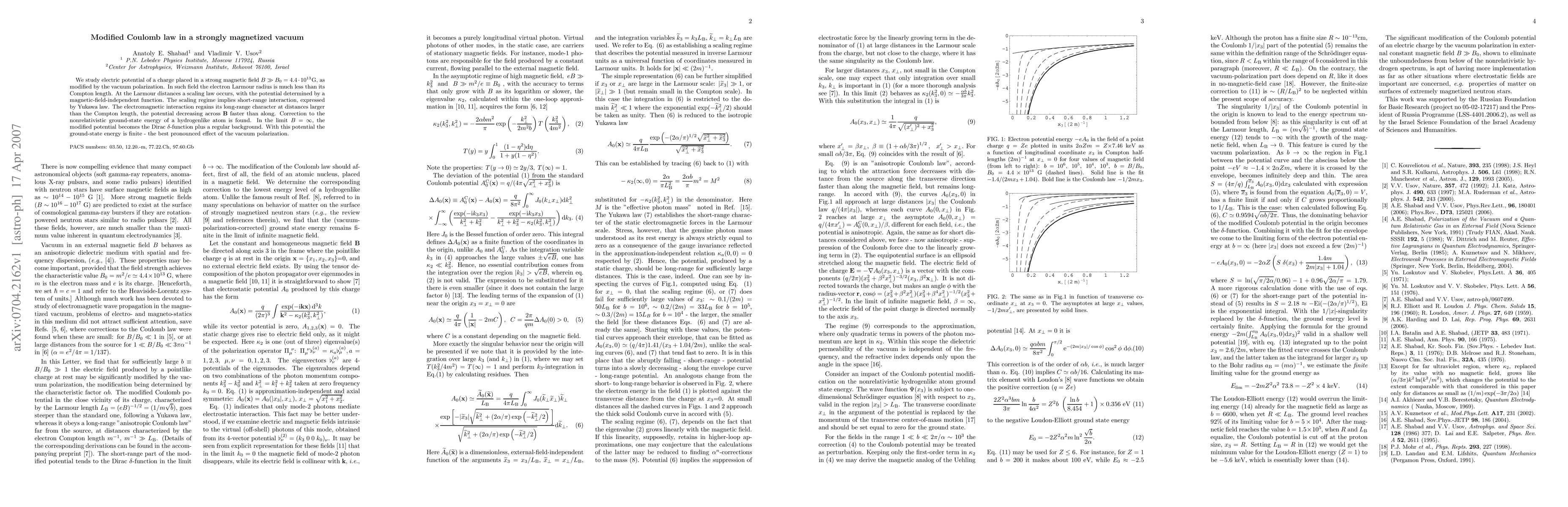 Researchers found a modified Coulomb law in strong magnetic fields, where vacuum polarization affects electric potential, leading to short-range interactions and corrections to atomic energies.