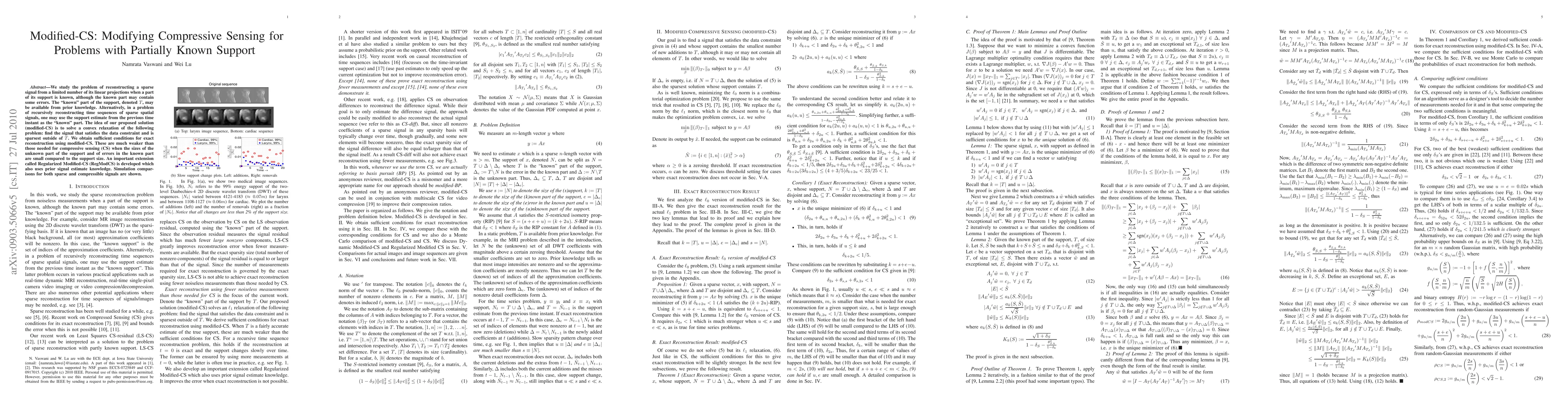 This paper proposes Modified-CS, a method for reconstructing sparse signals from limited linear projections when part of the signal's support is known with potential errors. It provides sufficient conditions for exact reconstruction that are less stringent than traditional compressive sensing, especially when the unknown part of the support and errors are small.