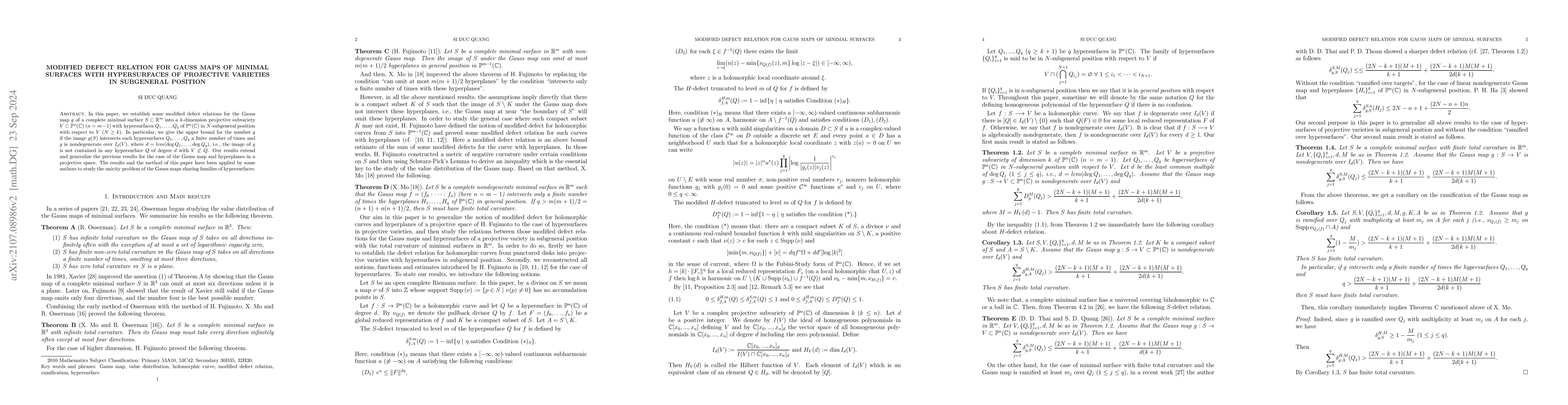 In this paper, we establish some modified defect relations for the Gauss map $g$ of a complete minimal surface $S\subset\mathbb R^m$ into a $k$-dimension projective subvariety $V\subset\mathbb P^n(\mathbb C)\ (n=m-1)$ with hypersurfaces $Q_1,\ldots,Q_q$ of $\mathbb P^n(\mathbb C)$ in $N$-subgeneral position with respect to $V\ (N\ge k)$. In particular, we give the bound above for the number $q$ if the image $g(S)$ intersects a finite number of times each hypersurfaces $Q_1,\ldots,Q_q$ and $g$ is nondegenerate over $I_d(V)$, where $d=lcm(deg Q_1,\ldots,deg Q_q)$, i.e., the image of $g$ is not contained in any hypersurface $Q$ of degree $d$ with $V\not\subset Q$. Our results extend and generalise previous results for the case of the Gauss map and hyperplanes in the projective spaces.