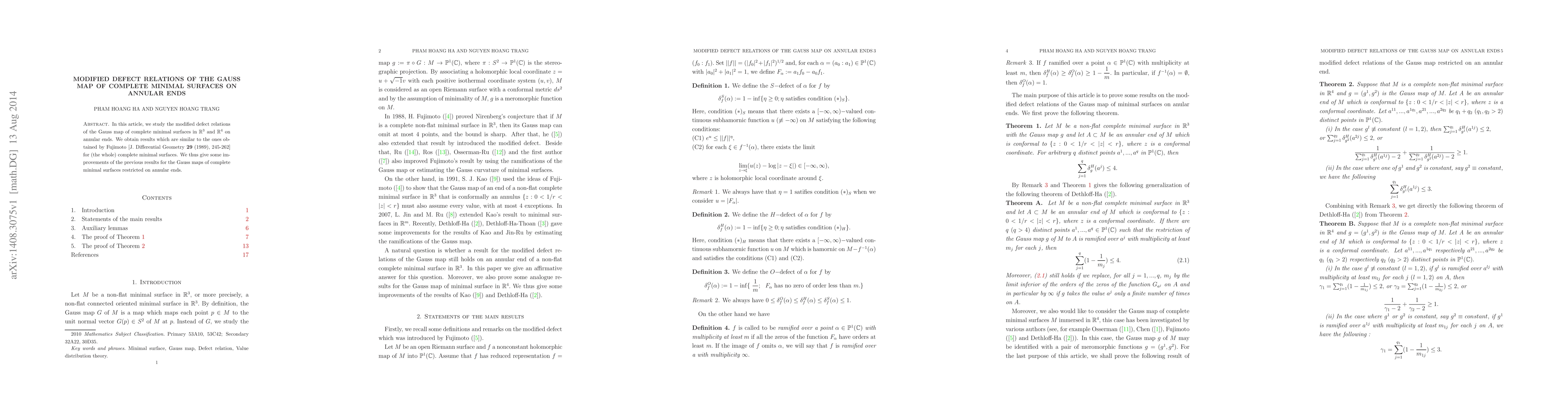 This paper investigates modified defect relations for the Gauss map of complete minimal surfaces in $\mathbb R^3$ and $\mathbb R^4$ specifically on annular ends, achieving results analogous to those found by Fujimoto for entire surfaces, thereby improving previous findings for annular regions.