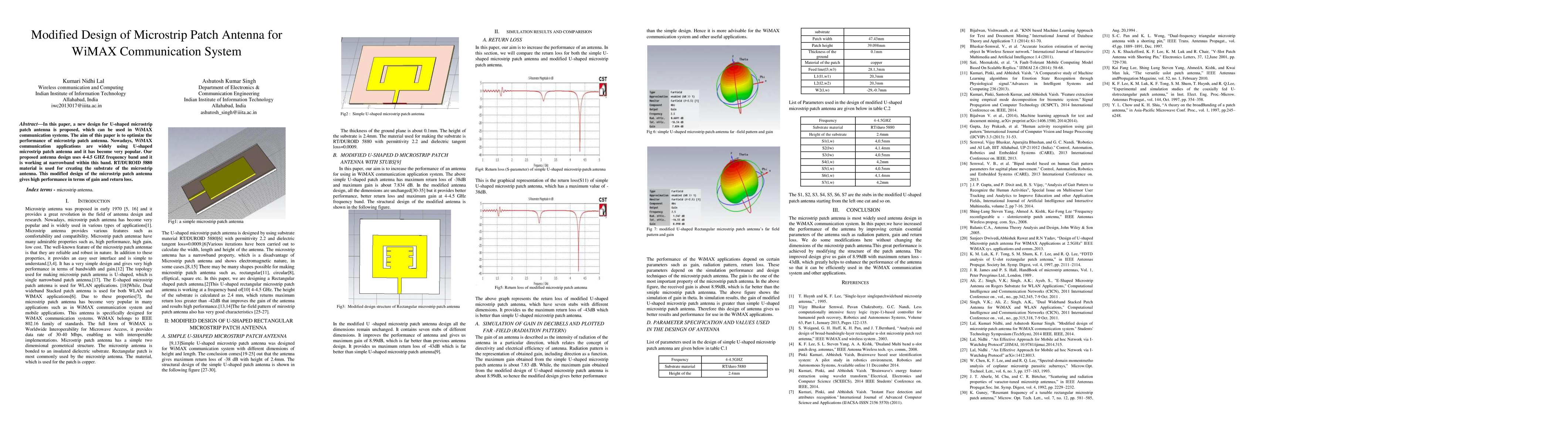The paper presents a modified U-shaped microstrip patch antenna design with stubs that enhances return loss and gain for WiMAX applications.