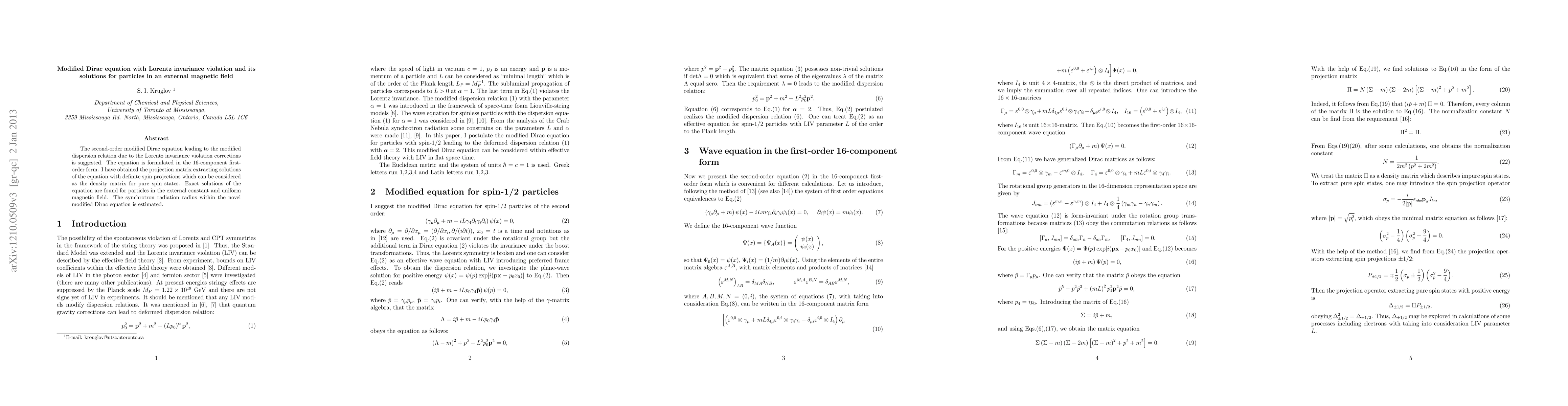 The second-order modified Dirac equation leading to the modified dispersion relation due to the Lorentz invariance violation corrections is suggested. The equation is formulated in the 16-component first- order form. I have obtained the projection matrix extracting solutions of the equation with definite spin projections which can be considered as the density matrix for pure spin states. Exact solutions of the equation are found for particles in the external constant and uniform magnetic field. The synchrotron radiation radius within the novel modified Dirac equation is estimated.