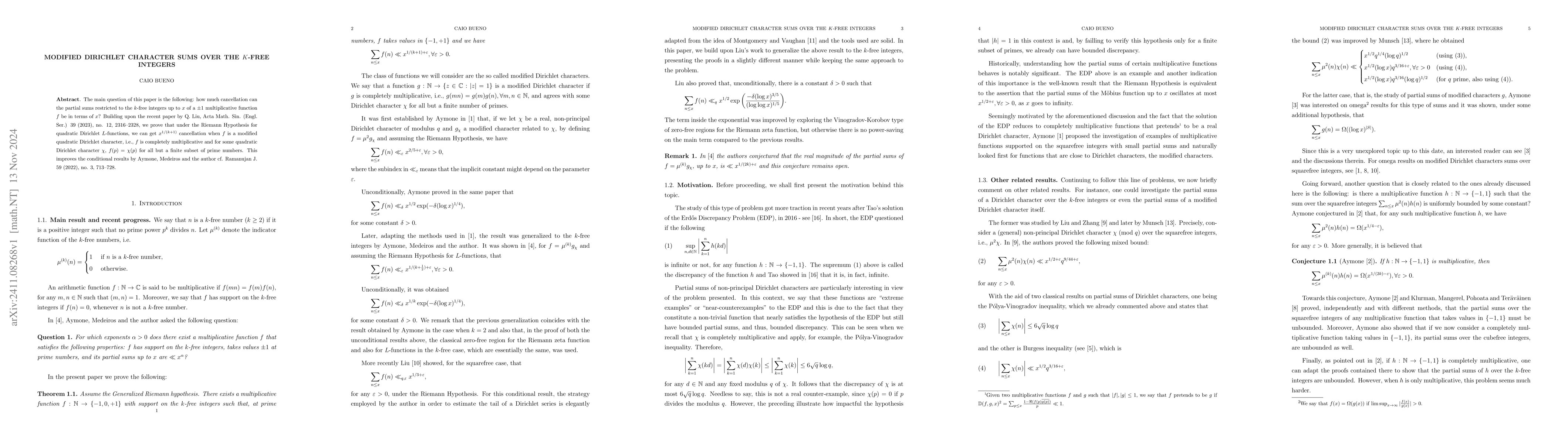 The main question of this paper is the following: how much cancellation can the partial sums restricted to the $k$-free integers up to $x$ of a $\pm 1$ multiplicative function $f$ be in terms of $x$? Building upon the recent paper by Q. Liu, Acta Math. Sin. (Engl. Ser.) 39 (2023), no. 12, 2316-2328, we prove that under the Riemann Hypothesis for quadratic Dirichlet $L$-functions, we can get $x^{1/(k+1)}$ cancellation when $f$ is a modified quadratic Dirichlet character, i.e., $f$ is completely multiplicative and for some quadratic Dirichlet character $\chi$, $f(p)=\chi(p)$ for all but a finite subset of prime numbers. This improves the conditional results by Aymone, Medeiros and the author cf. Ramanujan J. 59 (2022), no. 3, 713-728.