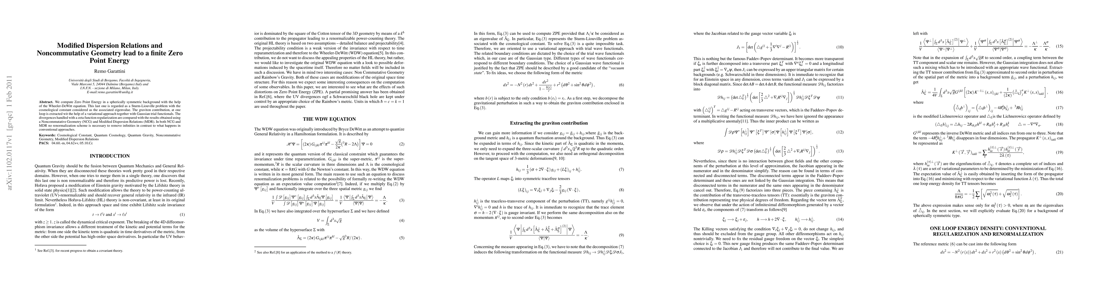 We compute Zero Point Energy in a spherically symmetric background with the help of the Wheeler-DeWitt equation. This last one is regarded as a Sturm-Liouville problem with the cosmological constant considered as the associated eigenvalue. The graviton contribution, at one loop is extracted wit the help of a variational approach together with Gaussian trial functionals. The divergences handled with a zeta function regularization are compared with the results obtained using a Noncommutative Geometry (NCG) and Modified Dispersion Relations (MDR). In both NCG and MDR no renormalization scheme is necessary to remove infinities in contrast to what happens in conventional approaches.