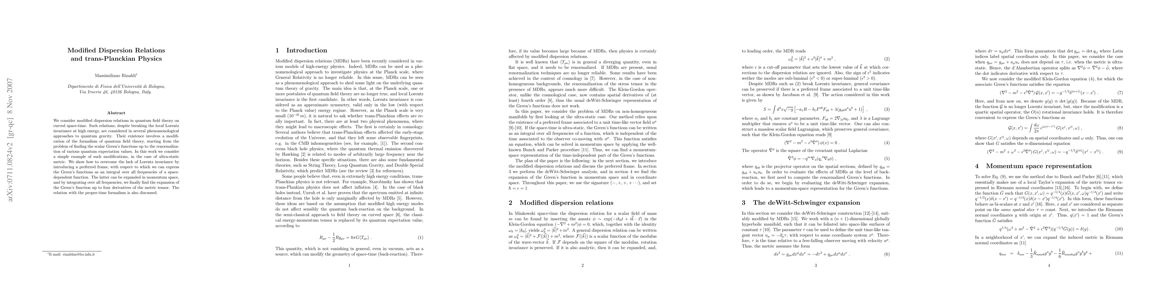 We consider modified dispersion relations in quantum field theory on curved space-time. Such relations, despite breaking the local Lorentz invariance at high energy, are considered in several phenomenological approaches to quantum gravity. Their existence involves a modification of the formalism of quantum field theory, starting from the problem of finding the scalar Green's functions up to the renormalization of various quantum expectation values. In this work we consider a simple example of such modifications, in the case of ultra-static metric. We show how to overcome the lack of Lorentz invariance by introducing a preferred frame, with respect to which we can express the Green's functions as an integral over all frequencies of a space-dependent function. The latter can be expanded in momentum space, and by integrating over all frequencies, we finally find the expansion of the Green's function up to four derivatives of the metric tensor. The relation with the proper-time formalism is also discussed.