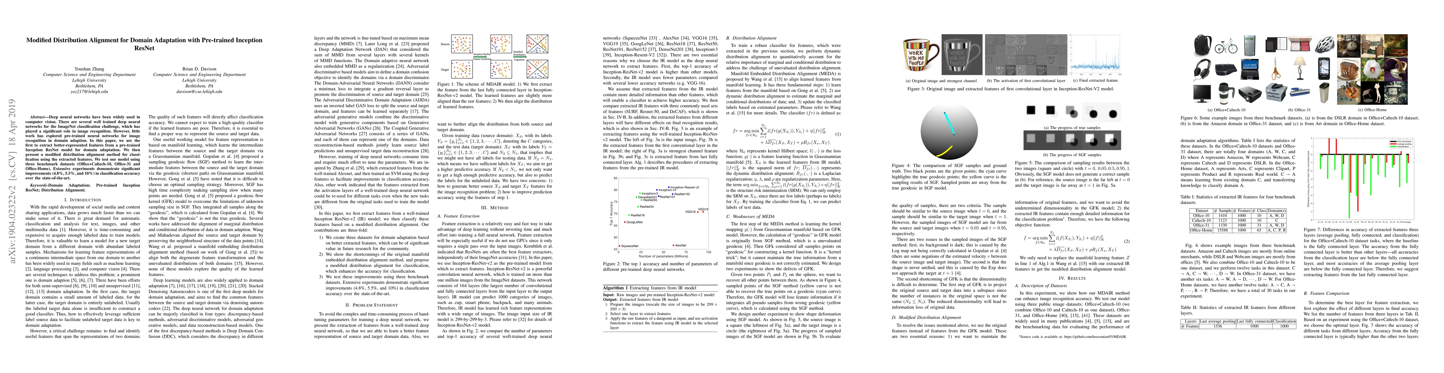 Deep neural networks have been widely used in computer vision. There are several well trained deep neural networks for the ImageNet classification challenge, which has played a significant role in image recognition. However, little work has explored pre-trained neural networks for image recognition in domain adaption. In this paper, we are the first to extract better-represented features from a pre-trained Inception ResNet model for domain adaptation. We then present a modified distribution alignment method for classification using the extracted features. We test our model using three benchmark datasets (Office+Caltech-10, Office-31, and Office-Home). Extensive experiments demonstrate significant improvements (4.8%, 5.5%, and 10%) in classification accuracy over the state-of-the-art.
