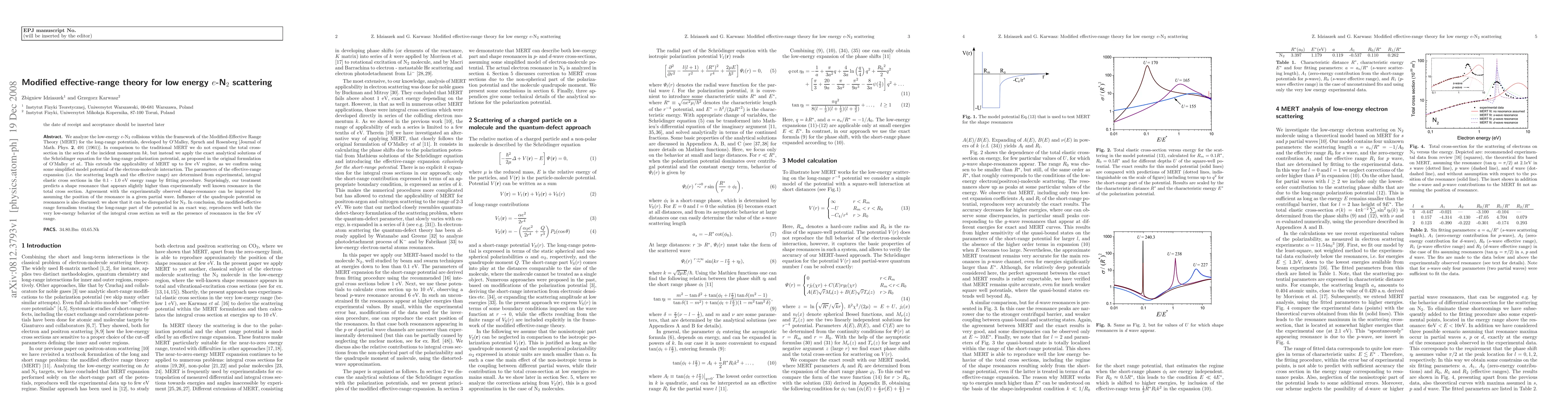 We analyze the low-energy e-N2 collisions within the framework of the Modified-Effective Range Theory (MERT) for the long-range potentials, developed by O'Malley, Spruch and Rosenberg [Journal of Math. Phys. 2, 491 (1961)]. In comparison to the traditional MERT we do not expand the total cross-section in the series of the incident momentum \hbar k, but instead we apply the exact analytical solutions of the Schroedinger equation for the long-range polarization potential, as proposed in the original formulation of O'Malley et al. This extends the applicability of MERT up to few eV regime, as we confirm using some simplified model potential of the electron-molecule interaction. The parameters of the effective-range expansion (i.e. the scattering length and the effective range) are determined from experimental, integral elastic cross sections in the 0.1 - 1.0 eV energy range by fitting procedure. Surprisingly, our treatment predicts a shape resonance that appears slightly higher than experimentally well known resonance in the total cross section. Agreement with the experimentally observed shape-resonance can be improved by assuming the position of the resonance in a given partial wave. Influence of the quadrupole potential on resonances is also discussed: we show that it can be disregarded for N2. In conclusion, the modified-effective range formalism treating the long-range part of the potential in an exact way, reproduces well both the very low-energy behavior of the integral cross section as well as the presence of resonances in the few eV range.