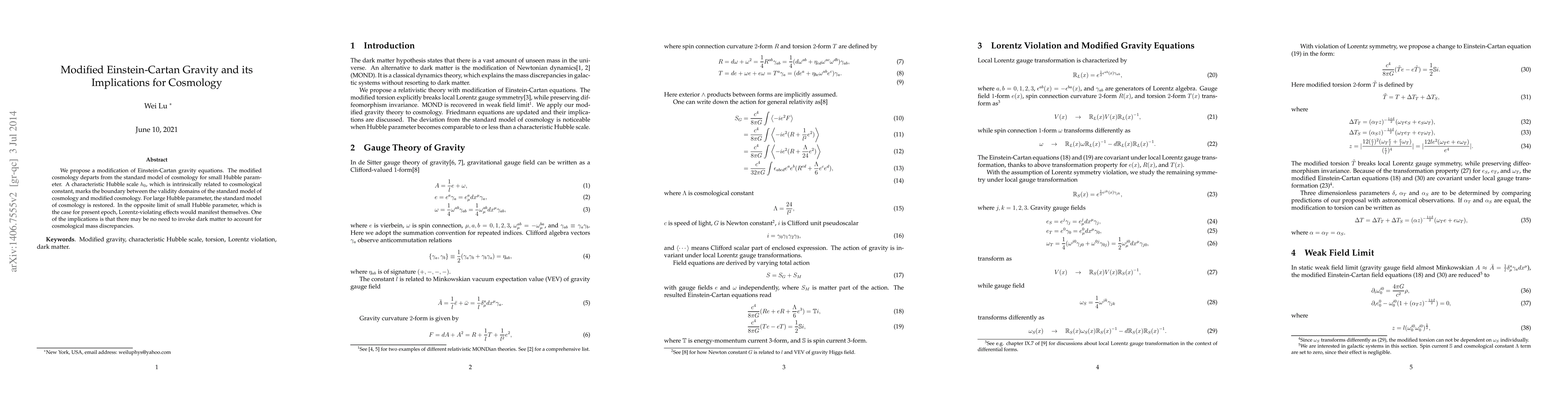 This paper proposes a modified version of Einstein-Cartan gravity, suggesting it could replace the standard cosmological model for small Hubble parameters. It implies Lorentz-violating effects and potentially eliminates the need for dark matter to explain mass discrepancies in cosmology.