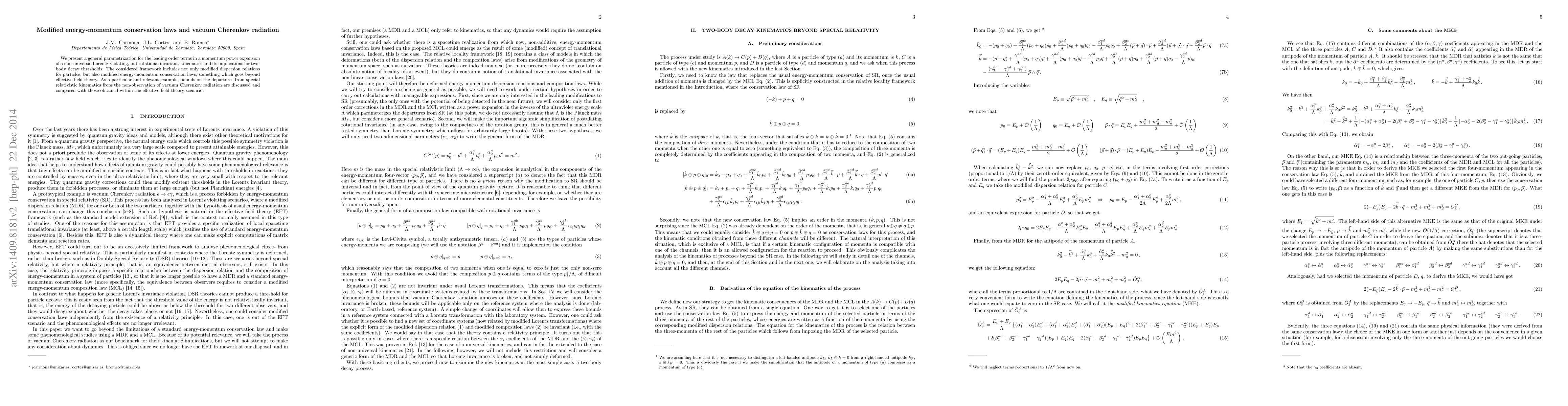 We present a general parametrization for the leading order terms in a momentum power expansion of a non-universal Lorentz-violating, but rotational invariant, kinematics and its implications for two-body decay thresholds. The considered framework includes not only modified dispersion relations for particles, but also modified energy-momentum conservation laws, something which goes beyond effective field theory. As a particular and relevant example, bounds on the departures from special relativistic kinematics from the non-observation of vacuum Cherenkov radiation are discussed and compared with those obtained within the effective field theory scenario.