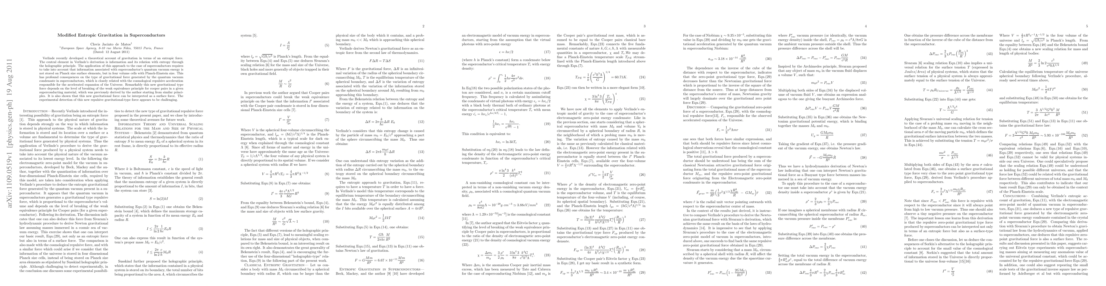 Verlinde recently developed a theoretical account of gravitation in terms of an entropic force. The central element in Verlinde's derivation is information and its relation with entropy through the holographic principle. The application of this approach to the case of superconductors requires to take into account that information associated with superconductor's quantum vacuum energy is not stored on Planck size surface elements, but in four volume cells with Planck-Einstein size. This has profound consequences on the type of gravitational force generated by the quantum vacuum condensate in superconductors, which is closely related with the cosmological repulsive acceleration responsible for the accelerated expansion of the Universe. Remarkably this new gravitational type force depends on the level of breaking of the weak equivalence principle for cooper pairs in a given superconducting material, which was previously derived by the author starting from similar principles. It is also shown that this new gravitational force can be interpreted as a surface force. The experimental detection of this new repulsive gravitational-type force appears to be challenging.