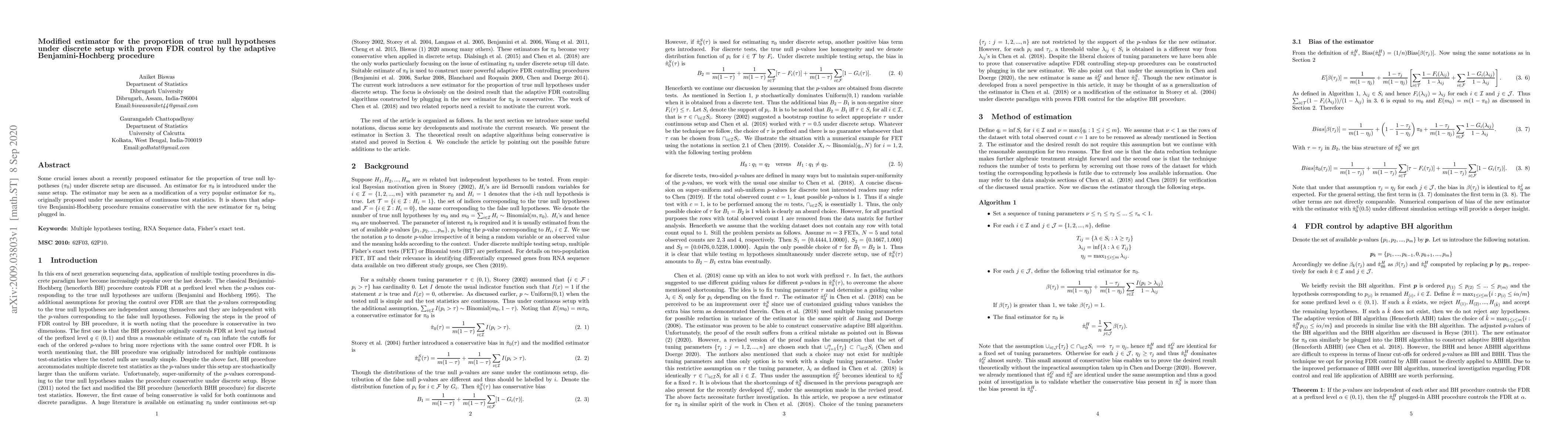 This paper proposes a modified estimator for the proportion of true null hypotheses ($\pi_0$) in a discrete setup, improving upon existing methods originally designed for continuous test statistics. The new estimator maintains control over the false discovery rate (FDR) when used with the adaptive Benjamini-Hochberg procedure.