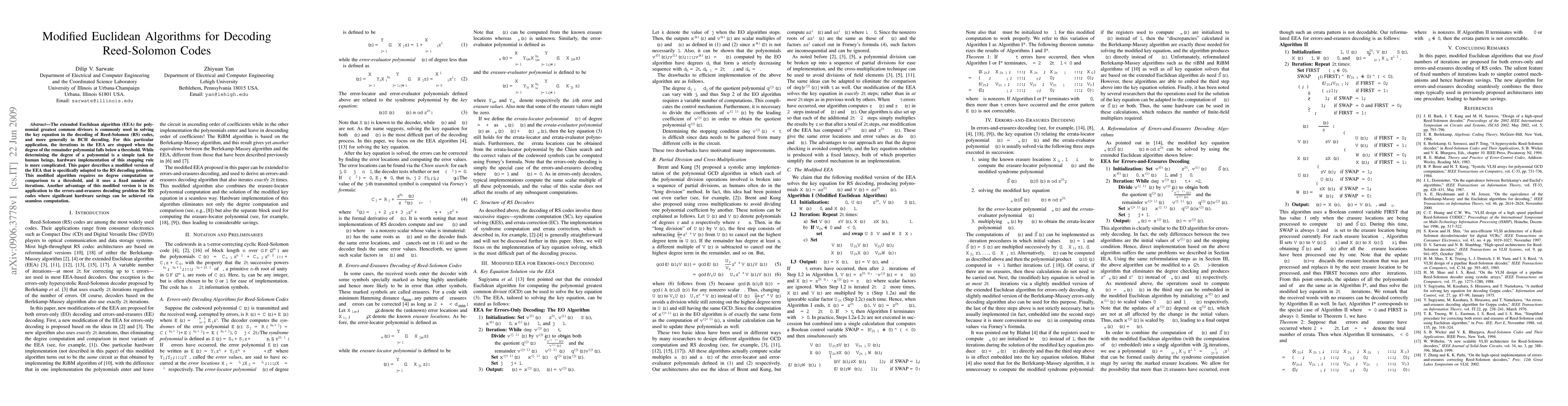 This paper proposes a modified Euclidean algorithm for decoding Reed-Solomon codes that eliminates the need for degree computation and threshold comparisons, using a fixed number of iterations for both decoding and errors-and-erasures scenarios, thus simplifying hardware implementation.