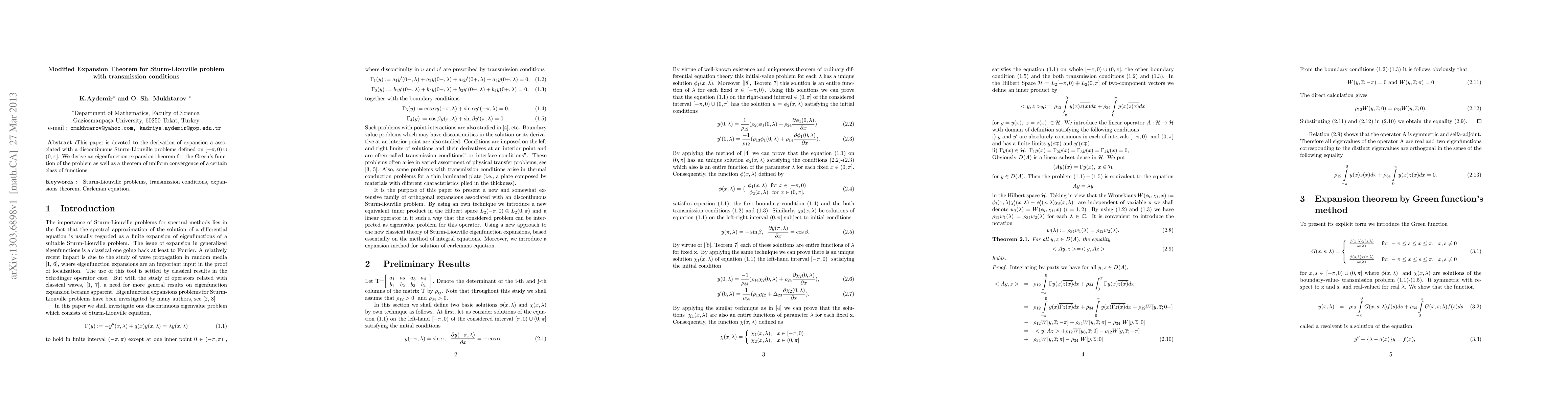 This paper is devoted to the derivation of expansion a associated with a discontinuous Sturm-Liouville problems defined on $[-\pi, 0)\cup(0,\pi]$. We derive an eigenfunction expansion theorem for the Green's function of the problem as well as a theorem of uniform convergence of a certain class of functions.