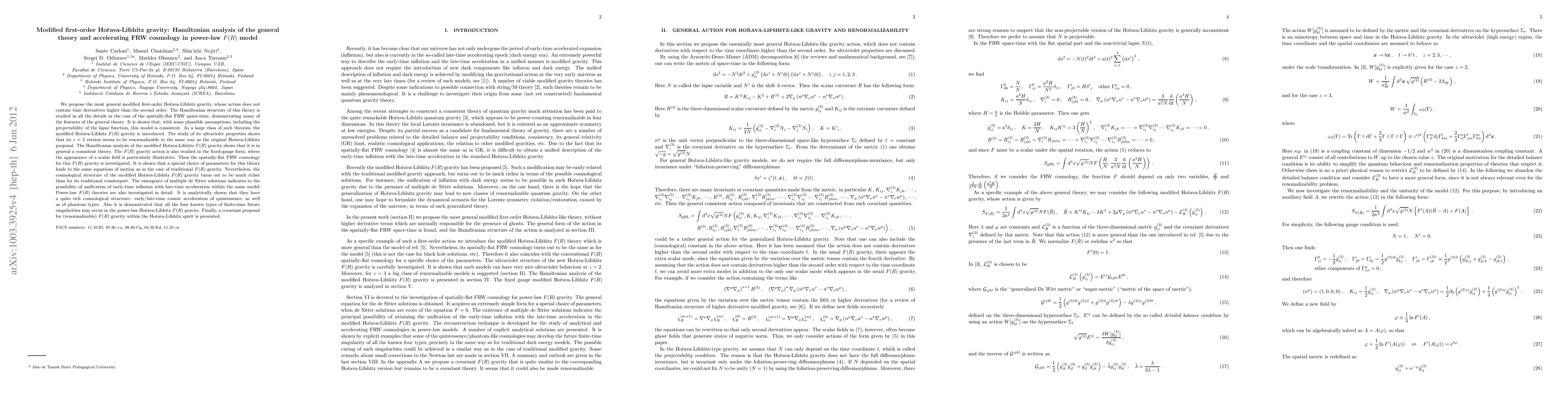 This paper presents a modified first-order Horava-Lifshitz gravity theory with a $F(R)$ model, demonstrating its Hamiltonian consistency and cosmological implications. It shows that the proposed $F(R)$ gravity can accommodate both early-time inflation and late-time acceleration, offering a unified framework for cosmological evolution.