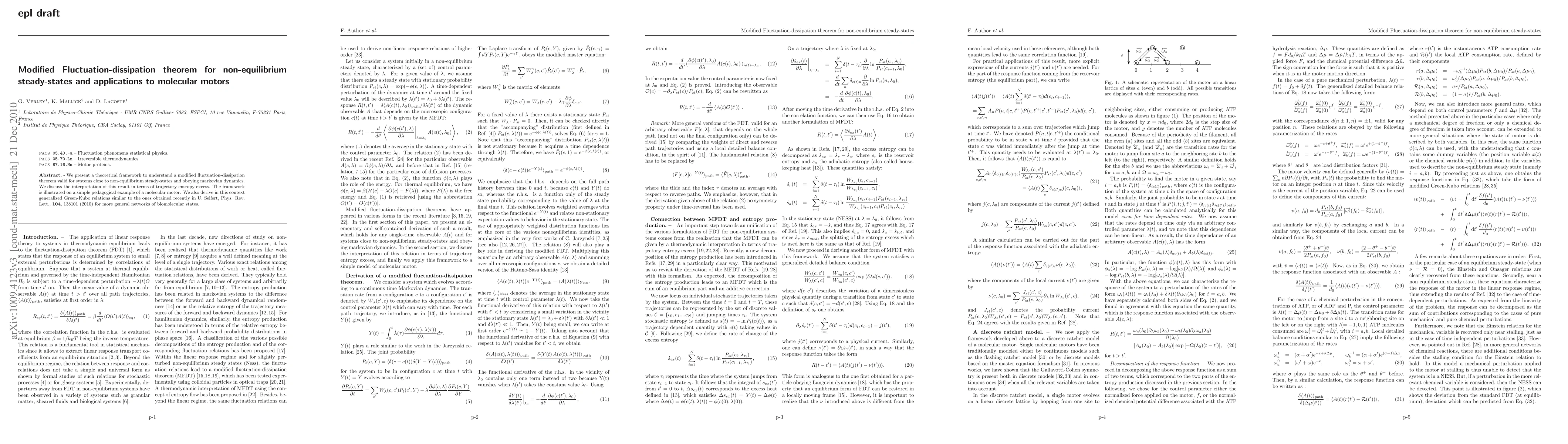 We present a theoretical framework to understand a modified fluctuation-dissipation theorem valid for systems close to non-equilibrium steady-states and obeying markovian dynamics. We discuss the interpretation of this result in terms of trajectory entropy excess. The framework is illustrated on a simple pedagogical example of a molecular motor. We also derive in this context generalized Green-Kubo relations similar to the ones derived recently by Seifert., Phys. Rev. Lett., 104, 138101 (2010) for more general networks of biomolecular states.