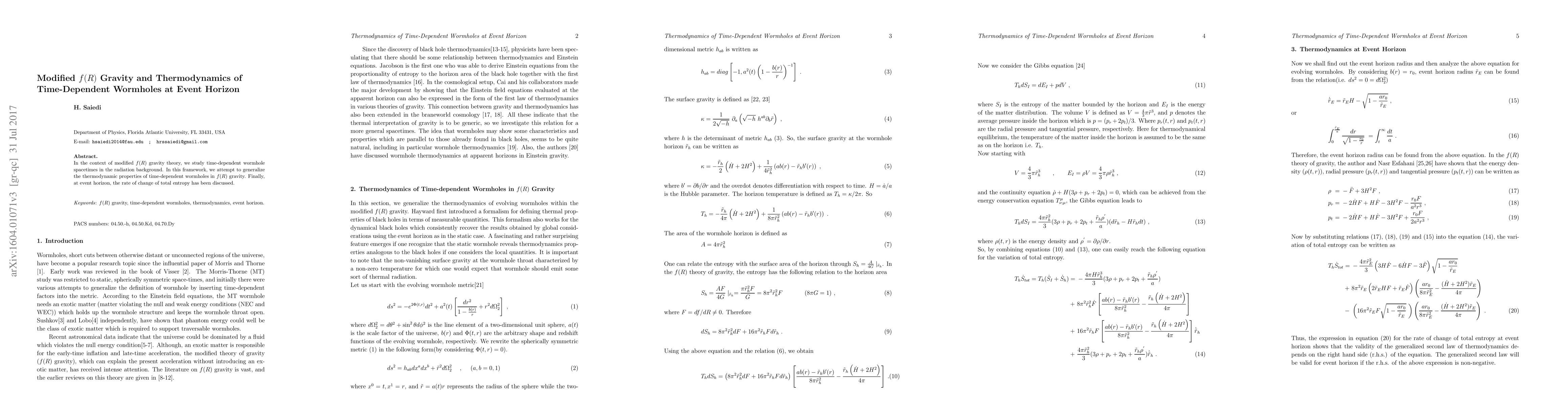 This paper explores time-dependent wormholes in the context of modified $f(R)$ gravity, focusing on their thermodynamic properties in a radiation background. It investigates the rate of change of total entropy at the event horizon, generalizing thermodynamic laws for these wormholes.