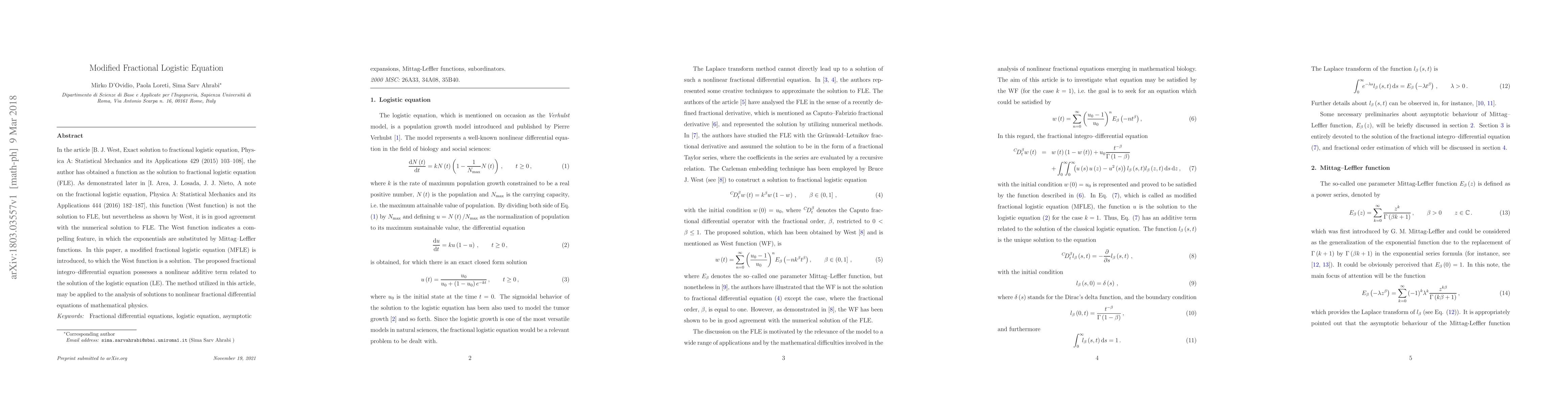 In the article [B.J.West, Exact solution to fractional logistic equation, Physica A: Statistical Mechanics and its Applications 429 (2015) 103-108], the author has obtained a function as the solution to fractional logistic equation (FLE). As demonstrated later in [I. Area, J. Losada, J. J. Nieto, A note on the fractional logistic equation, Physica A: Statistical Mechanics and its Applications 444 (2016) 182-187], this function (West function) is not the solution to FLE, but nevertheless as shown by West, it is in good agreement with the numerical solution to FLE. The West function indicates a compelling feature, in which the exponentials are substituted by Mittag-Leffler functions. In this paper, a modified fractional logistic equation (MFLE) is introduced, to which the West function is a solution. The proposed fractional integro-differential equation possesses a nonlinear additive term related to the solution of the logistic equation (LE). The method utilized in this article, may be applied to the analysis of solutions to nonlinear fractional differential equations of mathematical physics.