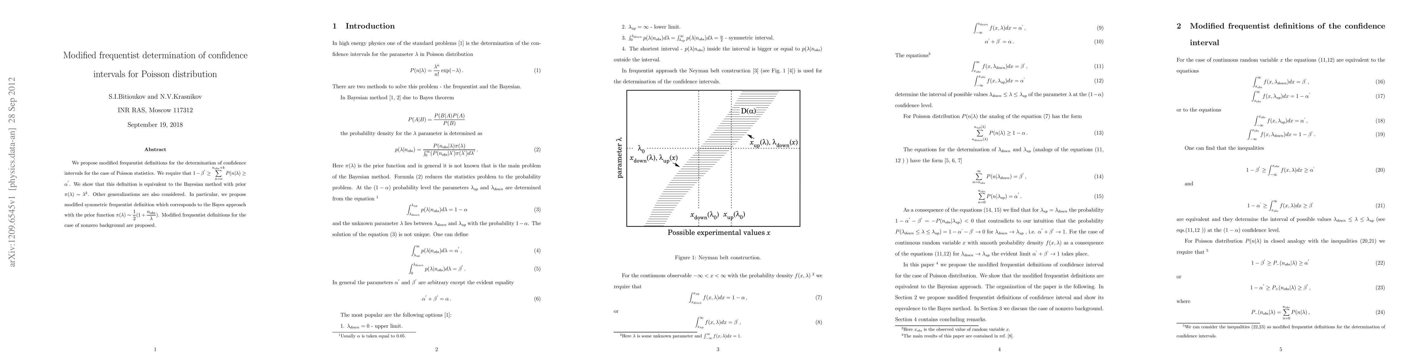 This paper proposes modified frequentist methods for determining confidence intervals in Poisson distributions, showing equivalence to Bayesian methods with specific priors. It also introduces a modified symmetric frequentist definition that aligns with a particular Bayesian prior and extends the approach to cases with nonzero background.