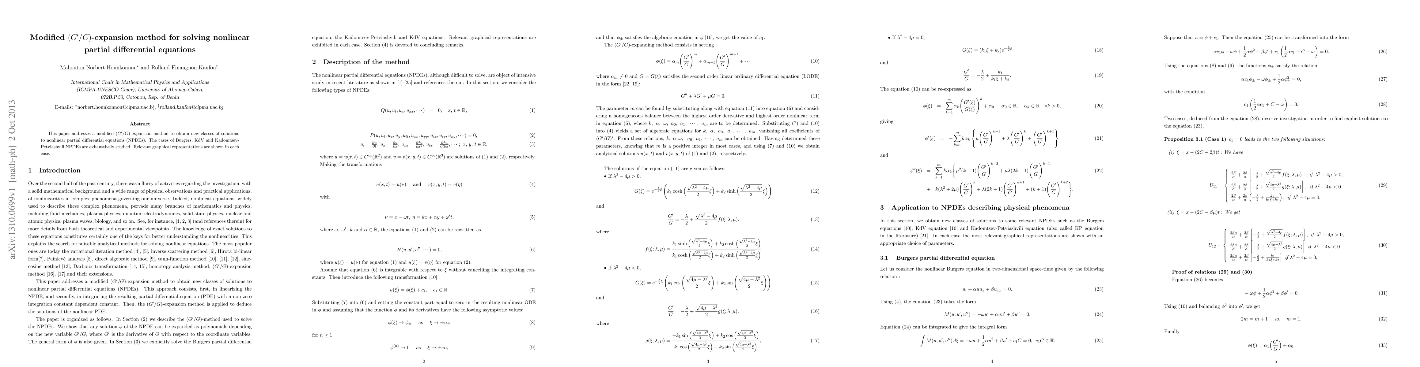 This paper introduces a modified ($G'/G$)-expansion method to derive new solutions for nonlinear partial differential equations (NPDEs), including the Burgers, KdV, and Kadomtsev-Petviashvili equations, with accompanying graphical representations for each case.