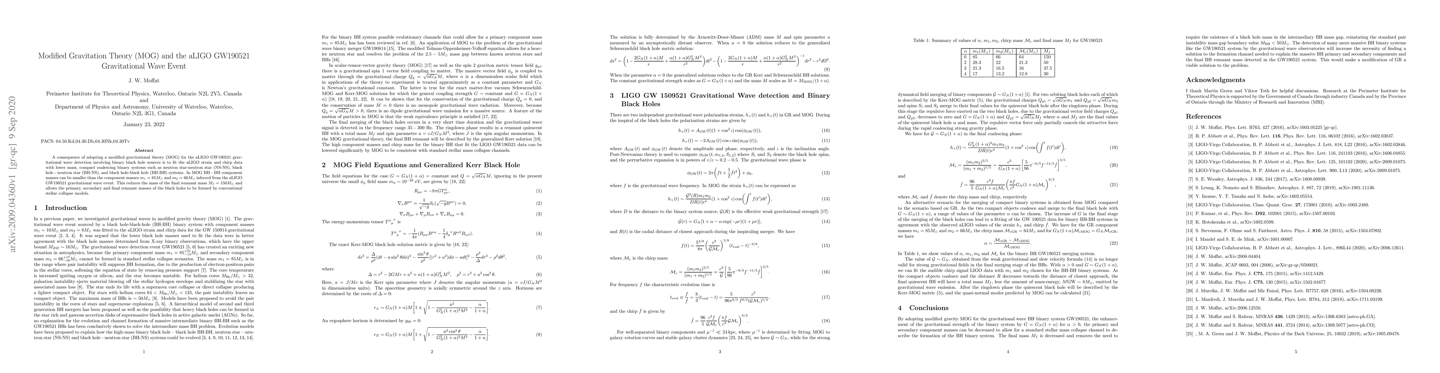 A consequence of adopting a modified gravitational theory (MOG) for the aLIGO GW190521 gravitational wave detection involving binary black hole sources is to fit the aLIGO strain and chirp data with lower mass, compact coalescing binary systems such as neutron star-neutron star (NS-NS), black hole - neutron star (BH-NS), and black hole-black hole (BH-BH) systems. In MOG BH - BH component masses can be smaller than the component masses $m_1=85M_\odot$ and $m_2=66M_\odot$ inferred from the aLIGO GW190521 gravitational wave event. This reduces the mass of the final remnant mass $M_f=150M_\odot$ and allows the primary, secondary and final remnant masses of the black holes to be formed by conventional stellar collapse models.