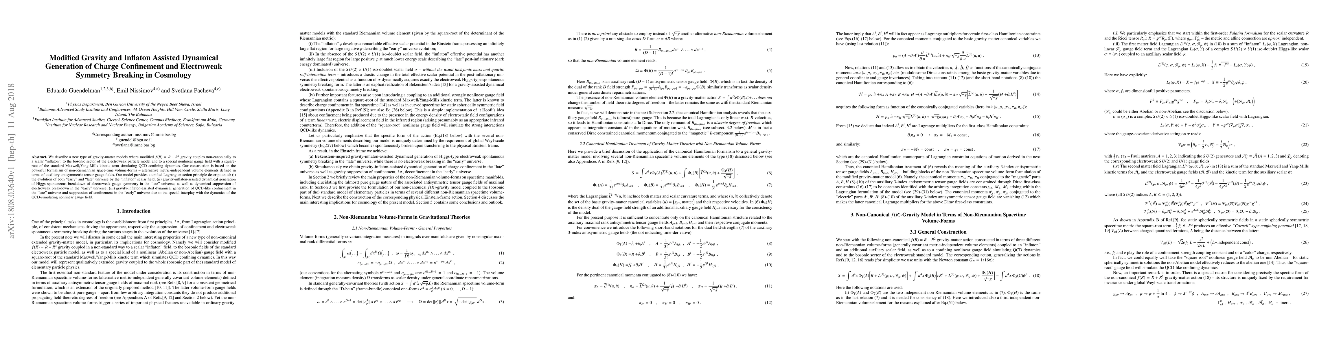 We describe a new type of gravity-matter models where modified f(R)=R+R^2 gravity couples non-canonically to a scalar "inflaton", to the bosonic sector of the electroweak particle model and to a special nonlinear gauge field with a square-root of the standard Maxwell/Yang-Mills kinetic term simulating QCD confining dynamics. Our construction is based on the powerful formalism of non-Riemannian space-time volume-forms - alternative metric-independent volume elements defined in terms of auxiliary antisymmetric tensor gauge fields. Our model provides a unified Lagrangian action principle description of: (i) the evolution of both "early" and "late" universe by the "inflaton" scalar field; (ii) gravity-inflaton-assisted dynamical generation of Higgs spontaneous breakdown of electroweak gauge symmetry in the "late" universe, as well as dynamical suppression of electroweak breakdown in the "early" universe; (iii) gravity-inflaton-assisted dynamical generation of QCD-like confinement in the "late" universe and suppression of confinement in the "early" universe due to the special interplay with the dynamics of the QCD-simulating nonlinear gauge field.