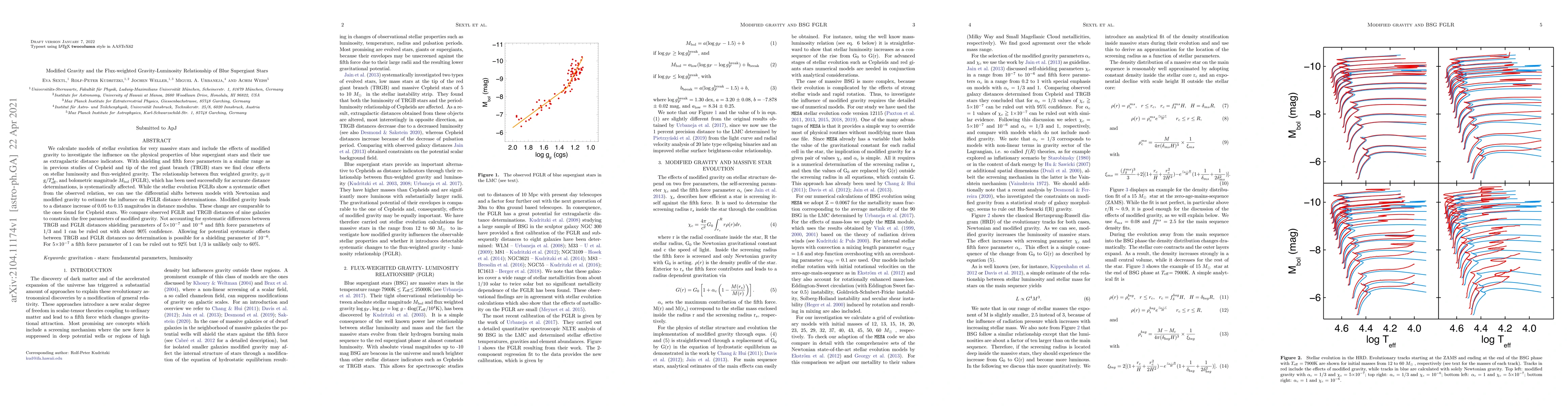 We calculate models of stellar evolution for very massive stars and include the effects of modified gravity to investigate the influence on the physical properties of blue supergiant stars and their use as extragalactic distance indicators. With shielding and fifth force parameters in a similar range as in previous studies of Cepheid and tip of the red giant branch (TRGB) stars we find clear effects on stellar luminosity and flux-weighted gravity. The relationship between flux weighted gravity, g_F = g/Teff^4, and bolometric magnitude M_bol (FGLR), which has been used successfully for accurate distance determinations, is systematically affected. While the stellar evolution FGLRs show a systematic offset from the observed relation, we can use the differential shifts between models with Newtonian and modified gravity to estimate the influence on FGLR distance determinations. Modified gravity leads to a distance increase of 0.05 to 0.15 magnitudes in distance modulus. These change are comparable to the ones found for Cepheid stars. We compare observed FGLR and TRGB distances of nine galaxies to constrain the free parameters of modified gravity. Not accounting for systematic differences between TRGB and FGLR distances shielding parameters of 5*10^-7 and 10^-6 and fifth force parameters of 1/3 and 1 can be ruled out with about 90% confidence. Allowing for potential systematic offsets between TRGB and FGLR distances no determination is possible for a shielding parameter of 10^-6. For 5*10$^-7 a fifth force parameter of 1 can be ruled out to 92% but 1/3 is unlikely only to 60%.