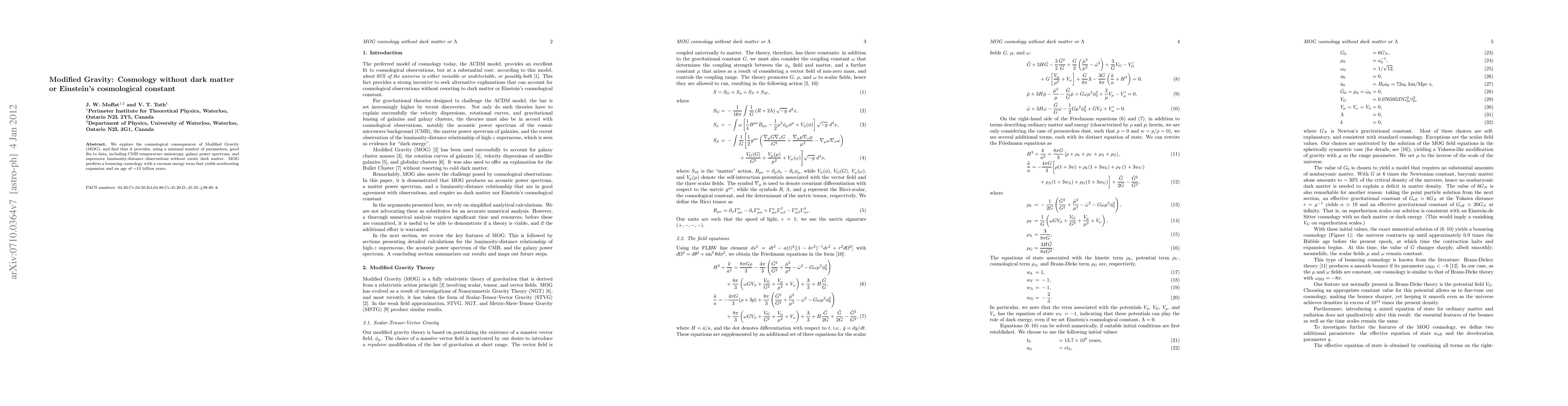 Summary: This paper investigates Modified Gravity (MOG) as an alternative to dark matter and the cosmological constant, demonstrating its ability to fit cosmological data like CMB and galaxy power spectrum, predicting a bouncing cosmology with accelerating expansion and an age of ~13 billion years.