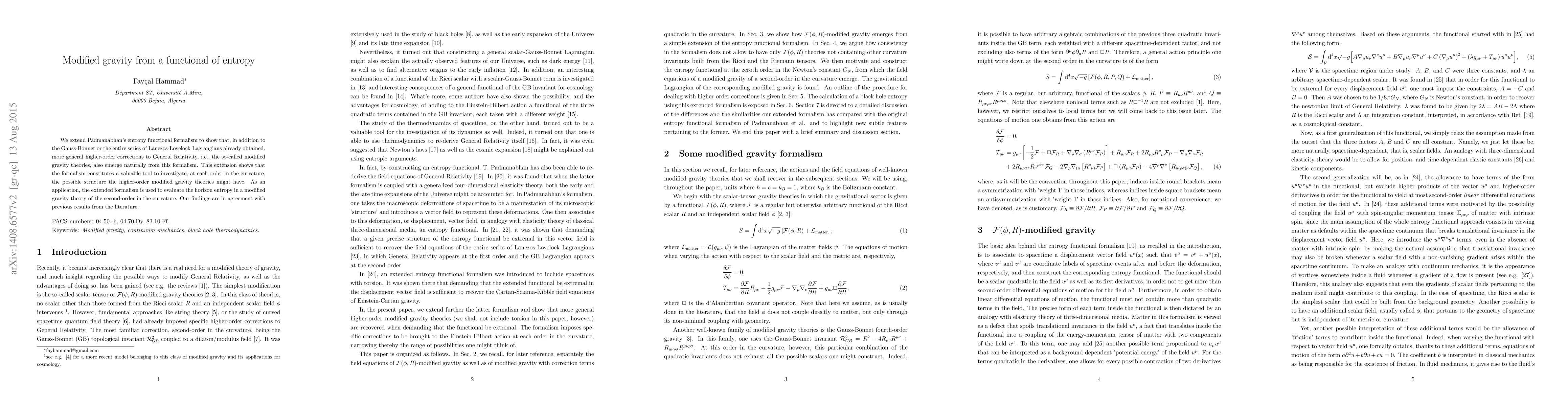 This paper extends Padmanabhan's entropy functional formalism to derive higher-order corrections to General Relativity, revealing new modified gravity theories. The formalism is applied to evaluate horizon entropy in a second-order modified gravity theory, corroborating existing results.