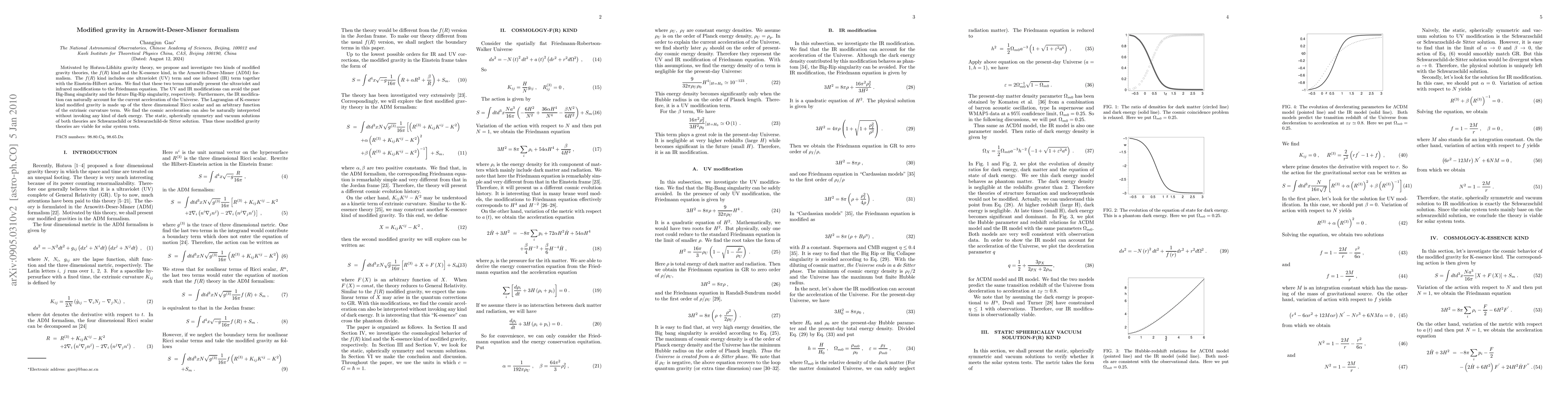 This paper proposes two modified gravity theories, f(R) and K-essence, within the Arnowitt-Deser-Misner formalism, inspired by Horava-Lifshitz gravity. These theories address singularities and cosmic acceleration without dark energy, while maintaining compatibility with solar system tests.