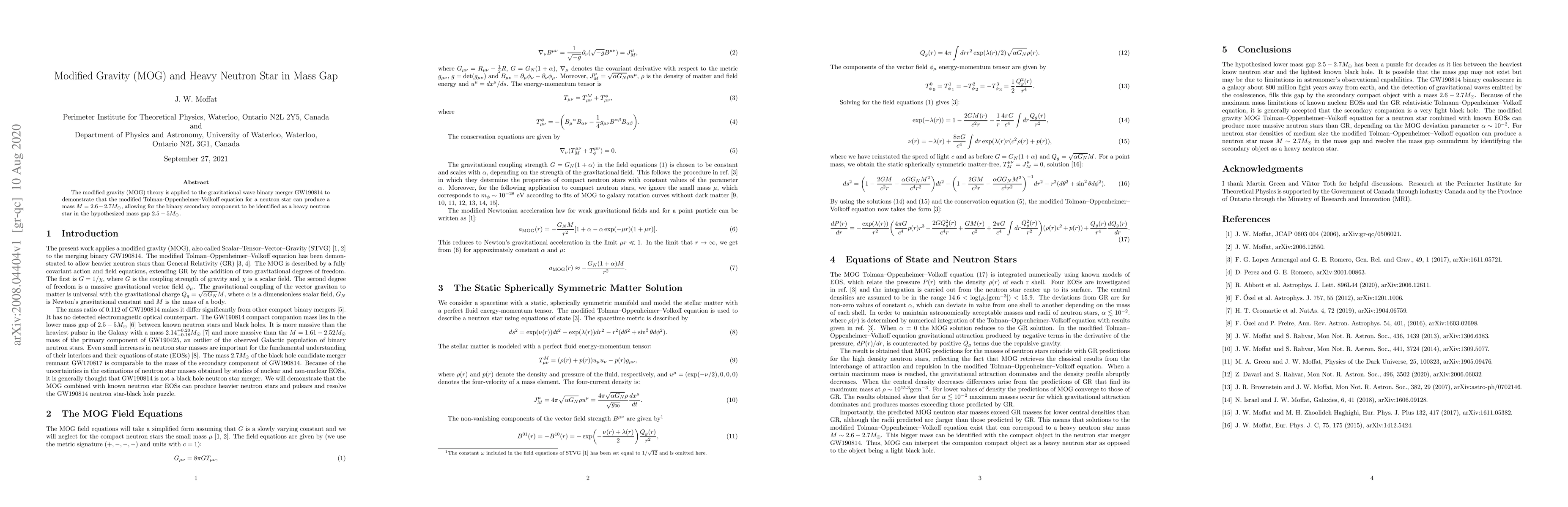 The modified gravity (MOG) theory is applied to the gravitational wave binary merger GW190814 to demonstrate that the modified Tolman-Oppenheimer-Volkoff equation for a neutron star can produce a mass $M=2.6 -2.7 M_\odot$, allowing for the binary secondary component to be identified as a heavy neutron star in the hypothesized mass gap $2.5 - 5 M_\odot$.