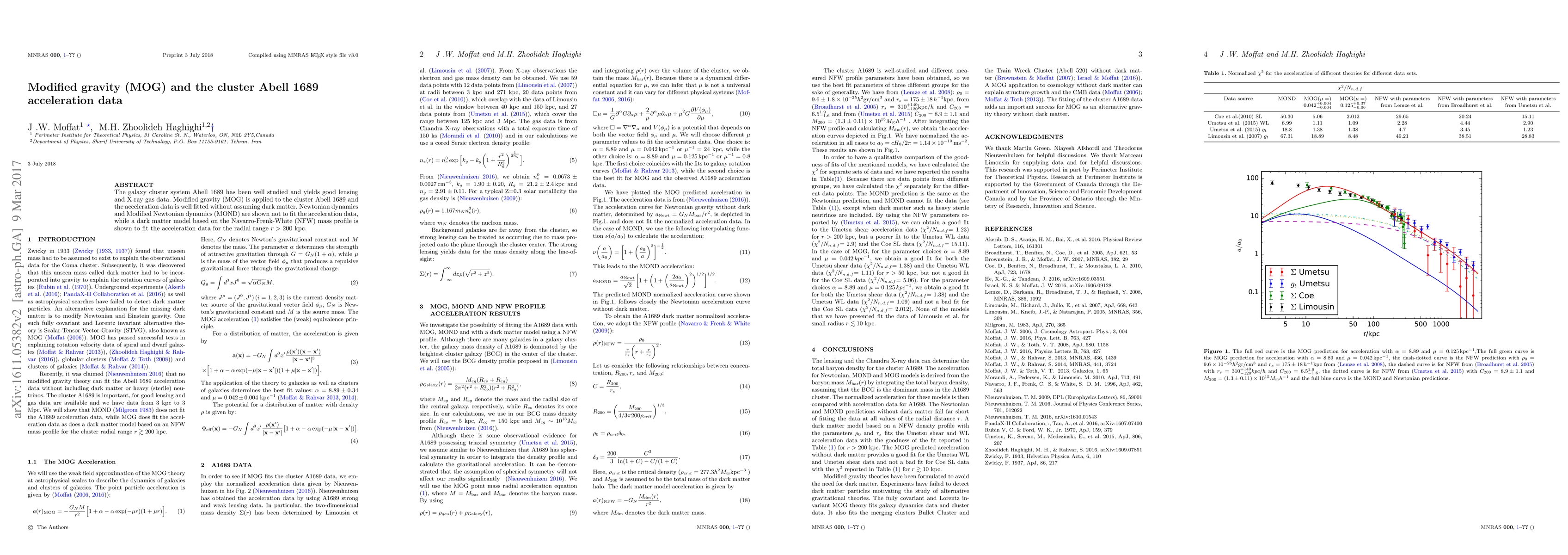 The paper presents a detailed comparison of MOG, MOND, and NFW dark matter model in fitting Abell 1689's acceleration data, highlighting MOG's ability to explain the observations without dark matter.