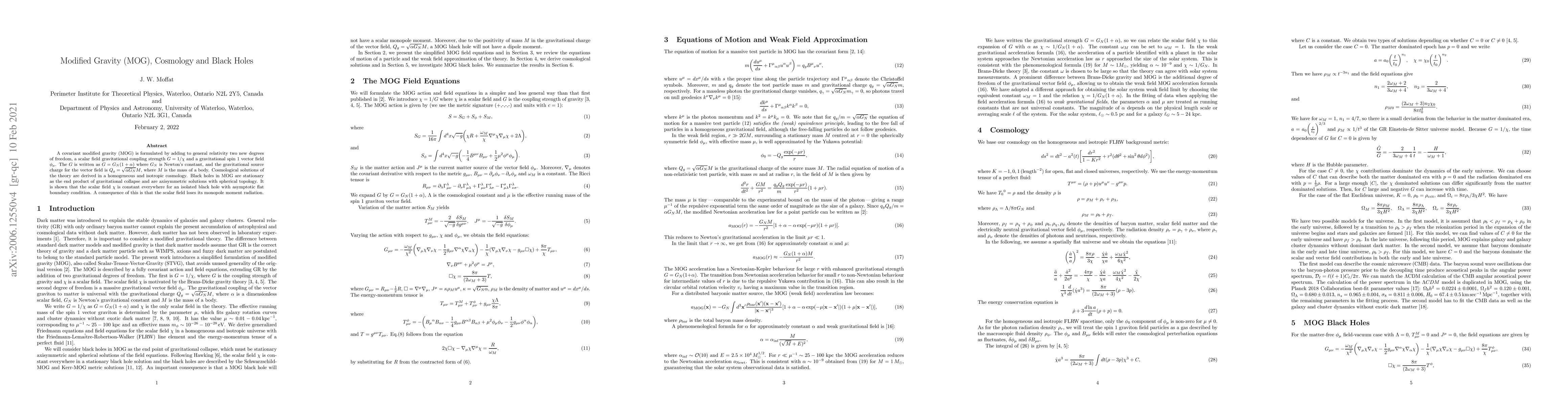 A covariant modified gravity (MOG) is formulated by adding to general relativity two new degrees of freedom, a scalar field gravitational coupling strength $G= 1/\chi$ and a gravitational spin 1 vector field $\phi_\mu$. The $G$ is written as $G=G_N(1+\alpha)$ where $G_N$ is Newton's constant, and the gravitational source charge for the vector field is $Q_g=\sqrt{\alpha G_N}M$, where $M$ is the mass of a body. Cosmological solutions of the theory are derived in a homogeneous and isotropic cosmology. Black holes in MOG are stationary as the end product of gravitational collapse and are axisymmetric solutions with spherical topology. It is shown that the scalar field $\chi$ is constant everywhere for an isolated black hole with asymptotic flat boundary condition. A consequence of this is that the scalar field loses its monopole moment radiation.