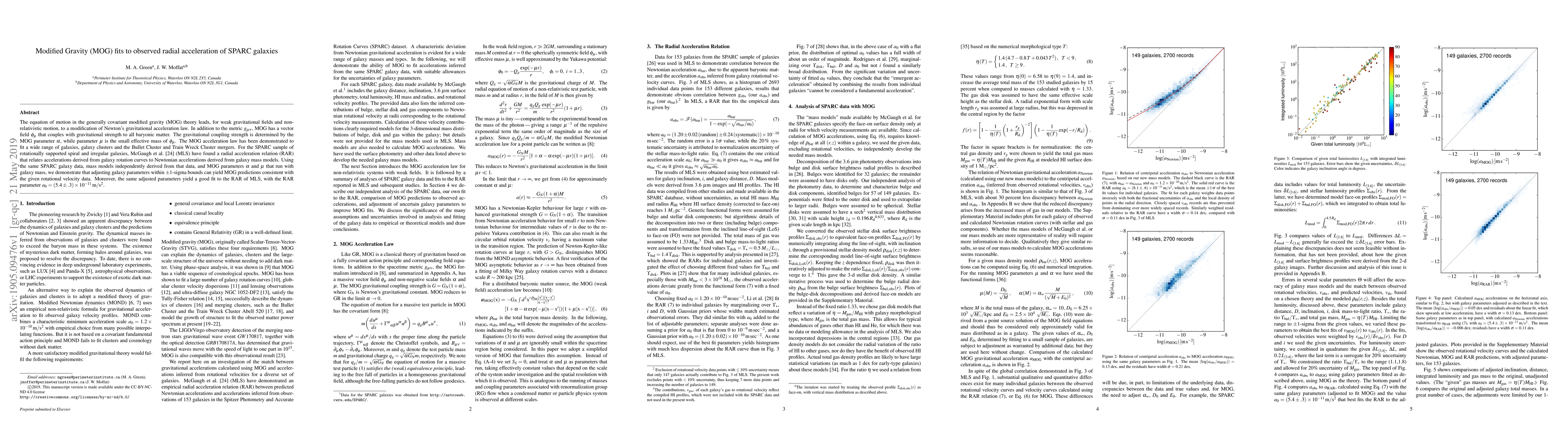 This paper demonstrates that modified gravity (MOG) theory can fit the radial acceleration relation (RAR) of the SPARC sample of galaxies, showing that MOG parameters adjusted within $\pm 1$-sigma bounds align well with observed rotational velocities and the RAR parameter $a_0=(5.4\pm .3)\times 10^{-11}\,{\rm m/s^2}$.