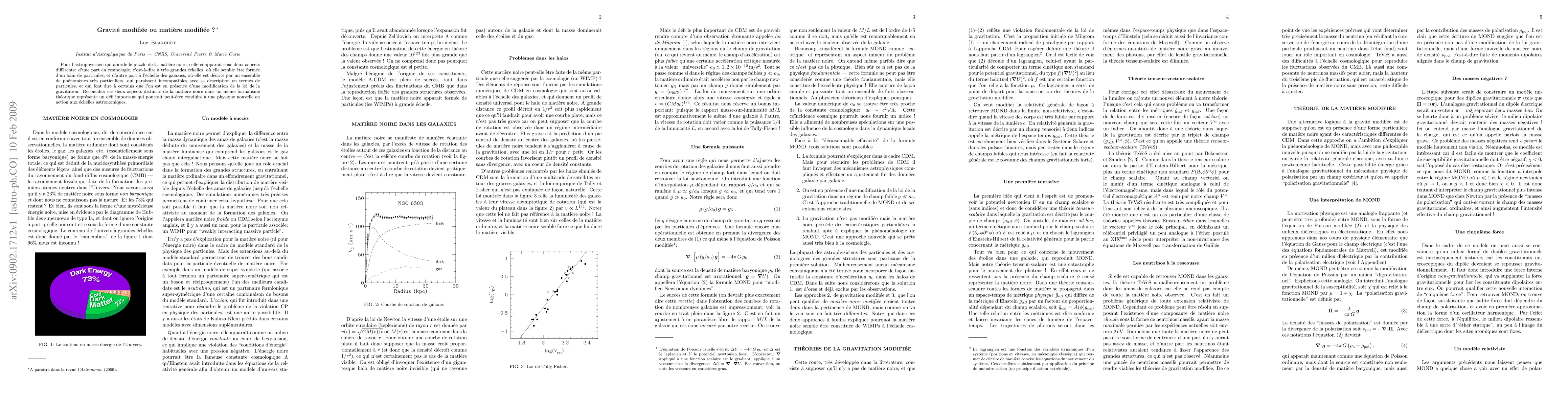 To the astrophysicist faced with the puzzle of dark matter, this one appears under two different aspects: on the one hand in cosmology, i.e. at very large scales, where it seems to be made of a bath of particles; on the other hand at the scale of galaxies, where it is described by a set of specific phenomena, looking incompatible with a description in terms of particles, and suggesting that we are seeing a modification of the law of gravity. Reconciling these two distinct aspects of dark matter in a single theoretical formalism is an important challenge which could lead to some new physics in action at astronomical scales.