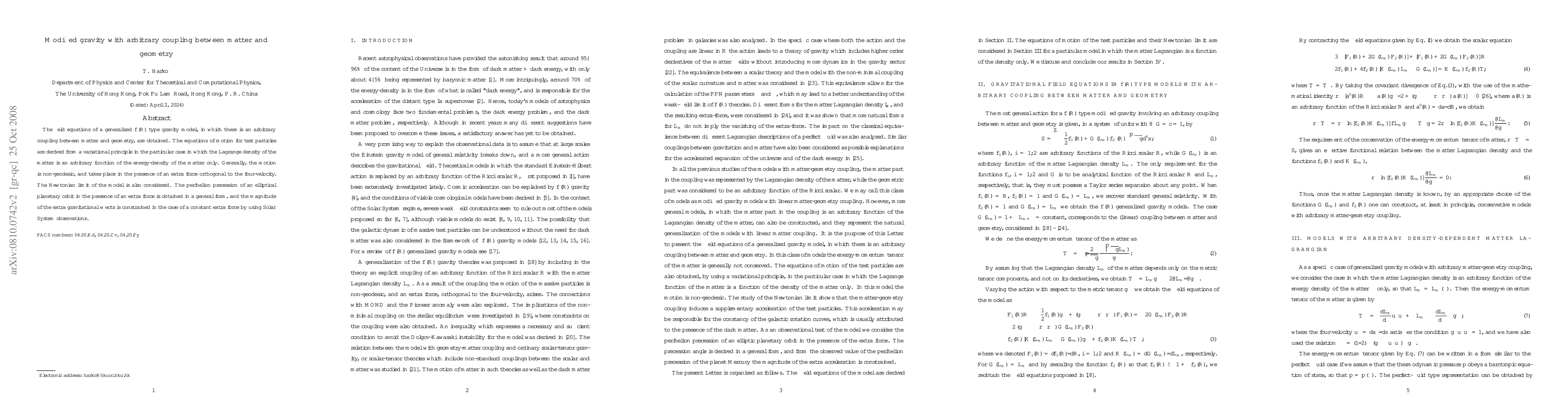 This paper derives the field equations of a generalized $f(R)$ gravity model with arbitrary coupling between matter and geometry, showing that test particles experience non-geodesic motion due to an extra force. The Newtonian limit and perihelion precession effects are analyzed, with constraints on the extra gravitational force derived from Solar System observations.