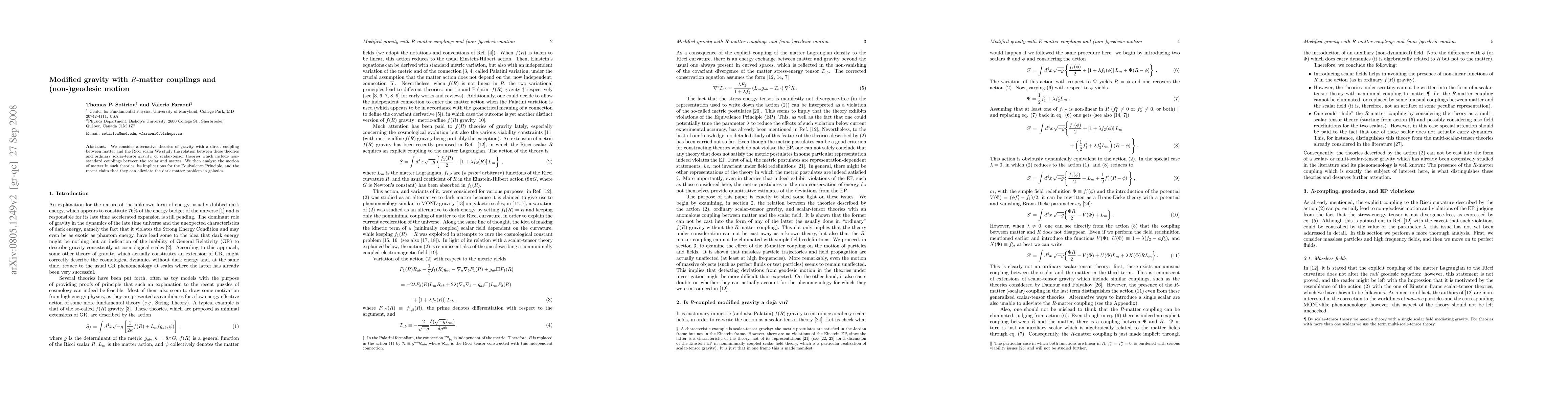 The paper explores modified gravity theories with Ricci scalar-matter couplings, linking them to scalar-tensor gravity and non-standard couplings. It examines matter motion implications, Equivalence Principle, and potential alleviation of the dark matter problem in galaxies.
