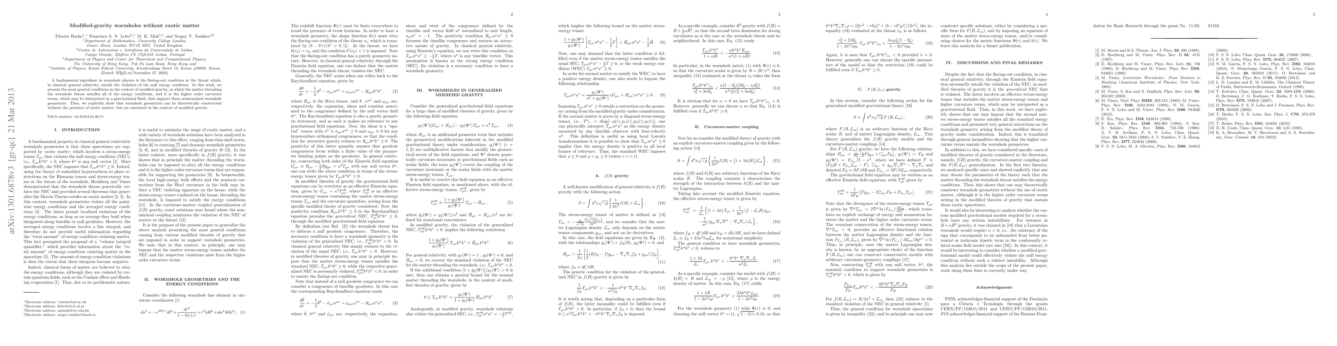 A fundamental ingredient in wormhole physics is the flaring-out condition at the throat which, in classical general relativity, entails the violation of the null energy condition. In this work, we present the most general conditions in the context of modified gravity, in which the matter threading the wormhole throat satisfies all of the energy conditions, and it is the higher order curvature terms, which may be interpreted as a gravitational fluid, that support these nonstandard wormhole geometries. Thus, we explicitly show that wormhole geometries can be theoretically constructed without the presence of exotic matter, but are sustained in the context of modified gravity.