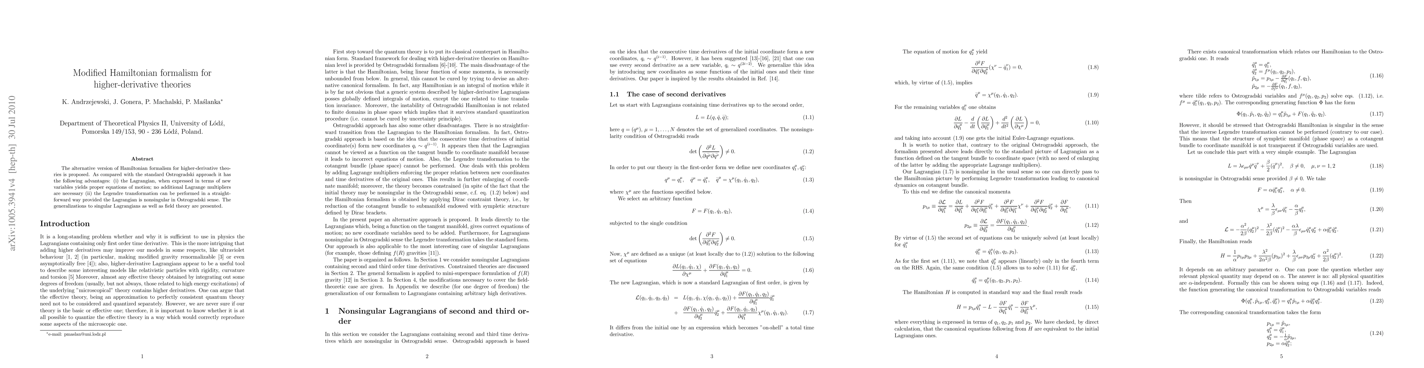 This paper proposes an alternative Hamiltonian formalism for higher-derivative theories, offering advantages over the standard Ostrogradski approach by providing proper equations of motion without additional Lagrange multipliers and enabling straightforward Legendre transformation for nonsingular Lagrangians. The method is generalized for singular Lagrangians and field theories.
