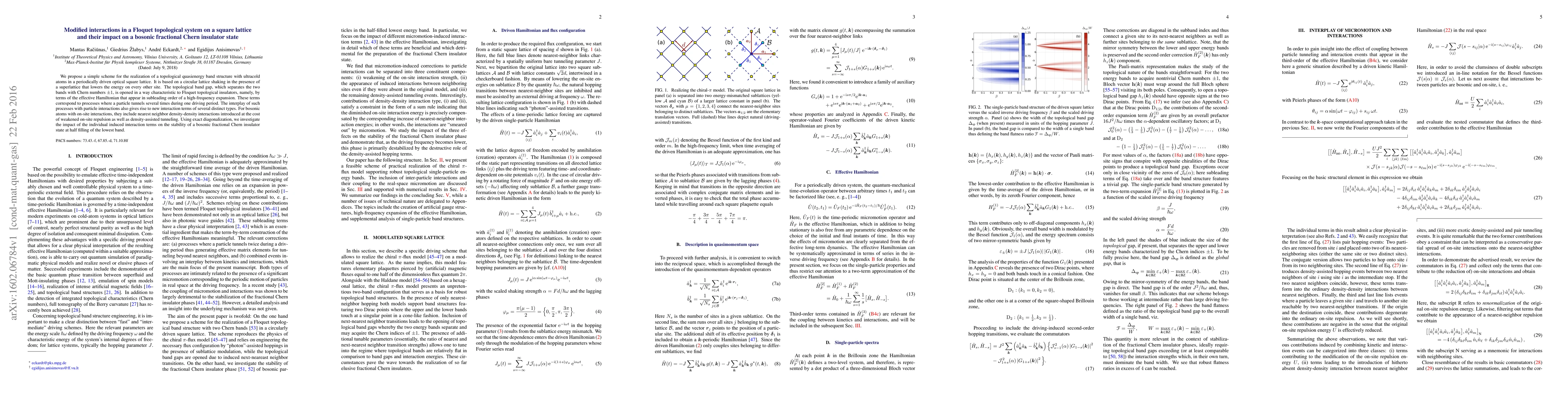 We propose a simple scheme for the realization of a topological quasienergy band structure with ultracold atoms in a periodically driven optical square lattice. It is based on a circular lattice shaking in the presence of a superlattice that lowers the energy on every other site. The topological band gap, which separates the two bands with Chern numbers $\pm 1$, is opened in a way characteristic to Floquet topological insulators, namely, by terms of the effective Hamiltonian that appear in subleading order of a high-frequency expansion. These terms correspond to processes where a particle tunnels several times during one driving period. The interplay of such processes with particle interactions also gives rise to new interaction terms of several distinct types. For bosonic atoms with on-site interactions, they include nearest neighbor density-density interactions introduced at the cost of weakened on-site repulsion as well as density-assisted tunneling. Using exact diagonalization, we investigate the impact of the individual induced interaction terms on the stability of a bosonic fractional Chern insulator state at half filling of the lowest band.