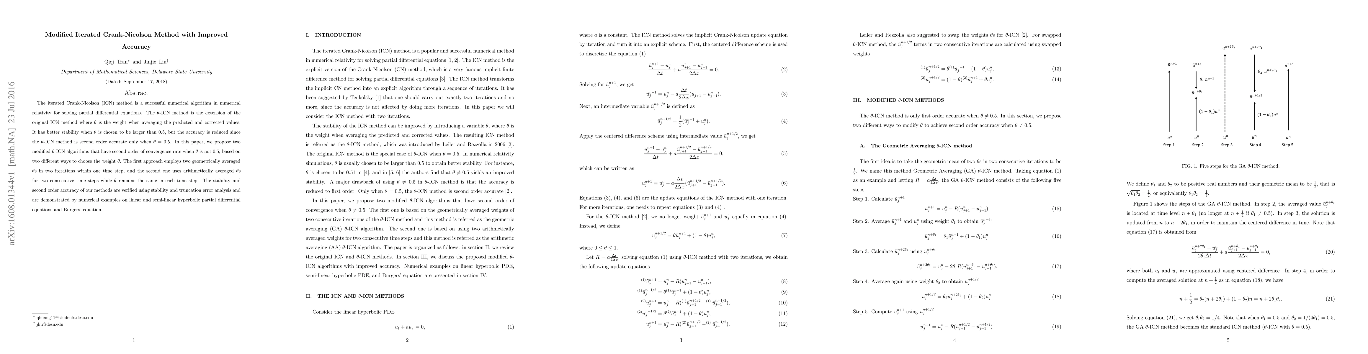 This paper proposes two modified iterated Crank-Nicolson methods with improved accuracy for solving partial differential equations in numerical relativity, achieving second-order convergence when θ is not 0.5.