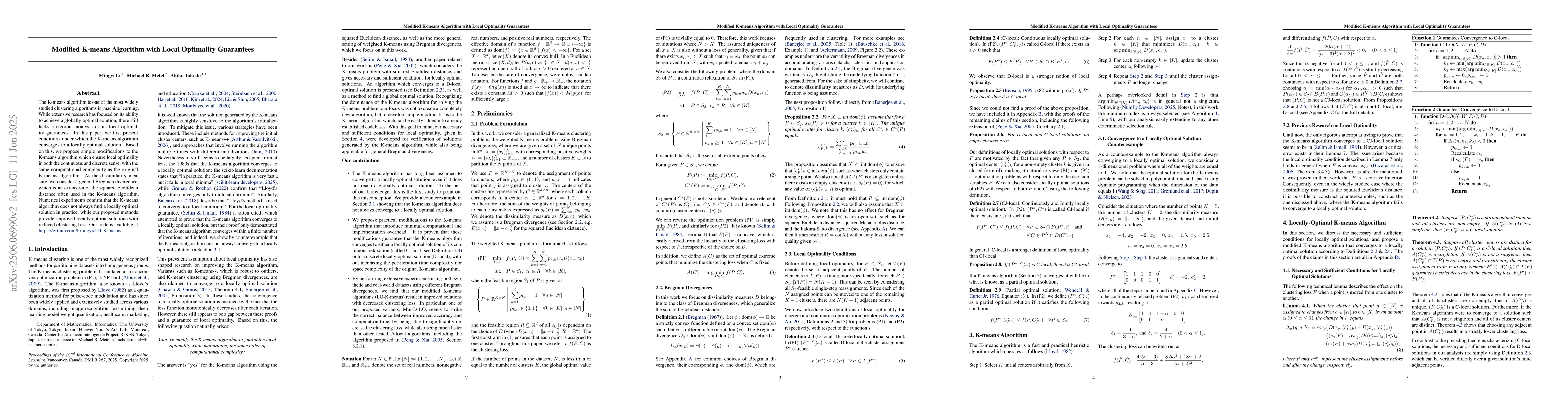 The paper presents a modified K-means algorithm with local optimality guarantees, analyzing conditions for convergence to a locally optimal solution and proposing modifications to ensure local optimality in both continuous and discrete senses.