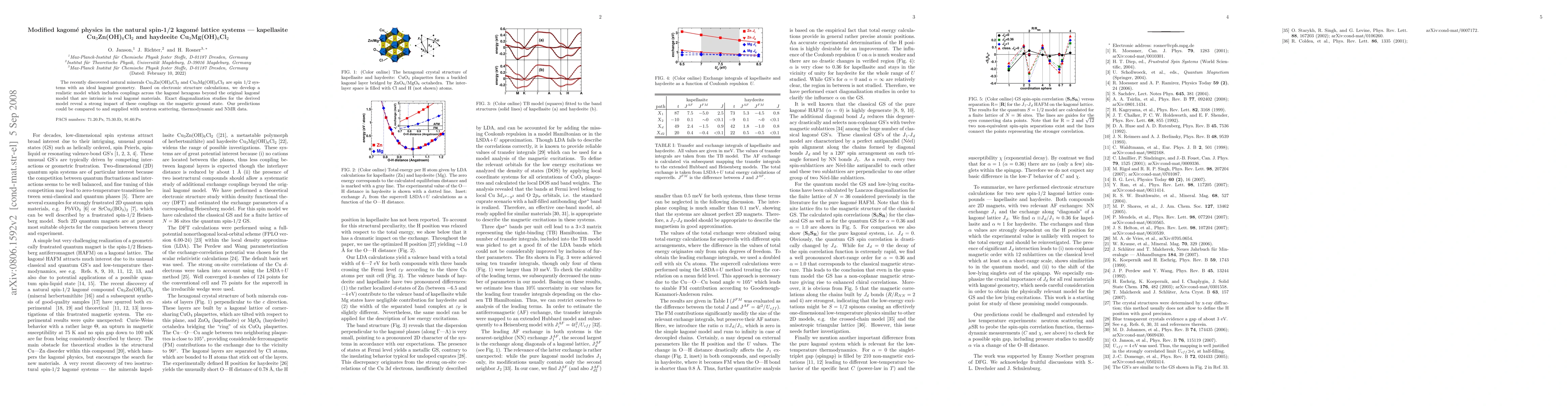 The recently discovered natural minerals Cu3Zn(OH)6Cl2 and Cu3Mg(OH)6Cl2 are spin 1/2 systems with an ideal kagome geometry. Based on electronic structure calculations, we develop a realistic model which includes couplings across the kagome hexagons beyond the original kagome model that are intrinsic in real kagome materials. Exact diagonalization studies for the derived model reveal a strong impact of these couplings on the magnetic ground state. Our predictions could be compared to and supplied with neutron scattering, thermodynamic and NMR data.