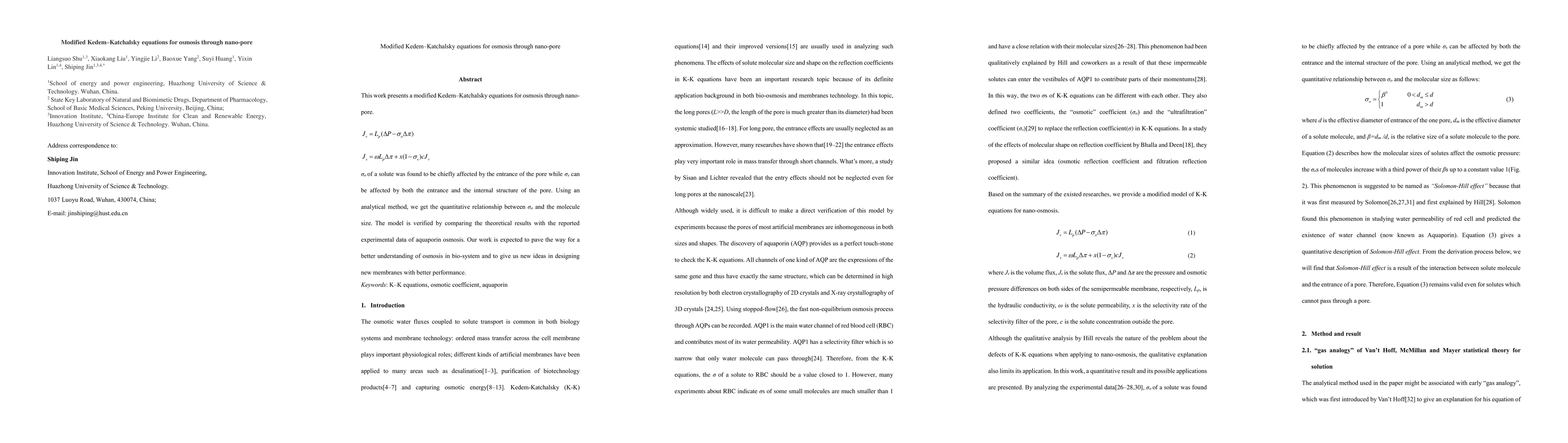 This paper modifies the Kedem-Katchalsky equations to describe osmosis through nano-pores, showing that the osmotic reflection coefficient is mainly influenced by pore entrance, while the filtration reflection coefficient is affected by both entrance and pore structure. The analytical model correlates molecule size with the osmotic reflection coefficient and is validated against aquaporin osmosis data, potentially aiding in designing better membranes.