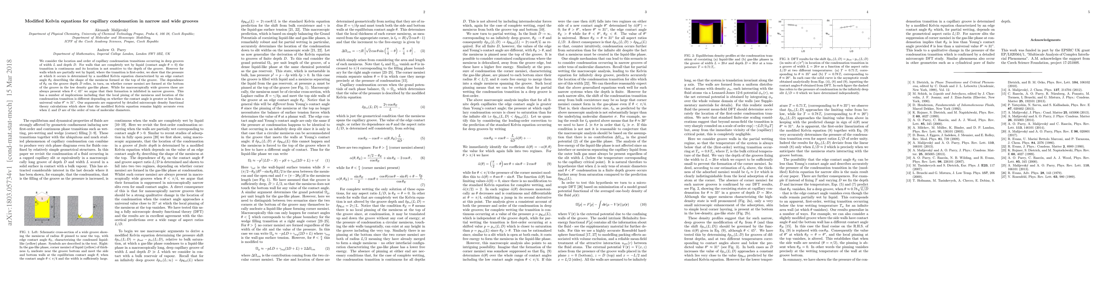 This paper investigates capillary condensation in grooves of varying widths, showing that the transition's location and order depend on the groove's geometry and the liquid's contact angle. For partially wet walls, the transition is first-order and governed by a modified Kelvin equation involving an edge contact angle, which varies with groove depth and the presence of corner menisci.