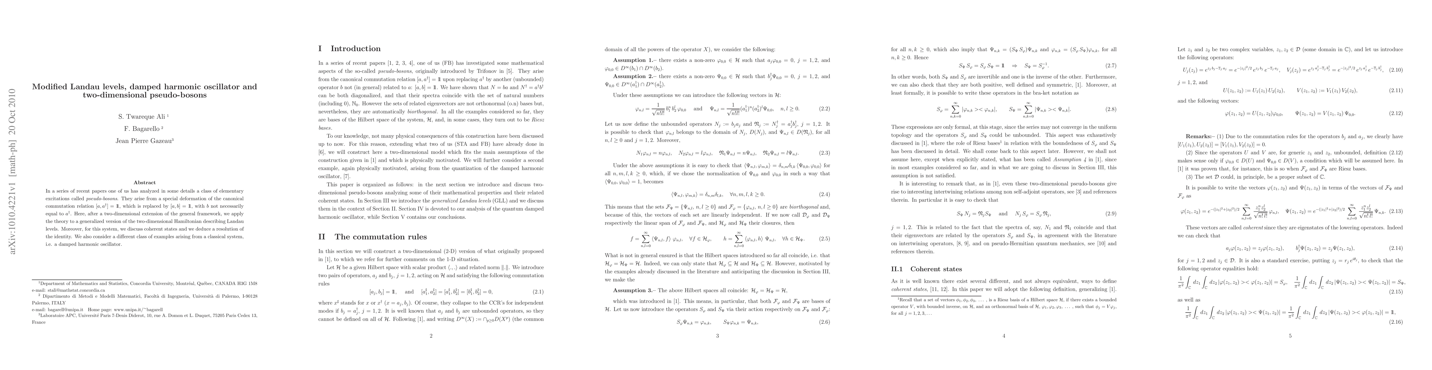 This paper extends a theory of pseudo-bosons to two-dimensional systems, applying it to modified Landau levels and deriving coherent states and a resolution of the identity. It also explores a damped harmonic oscillator as a classical analog.