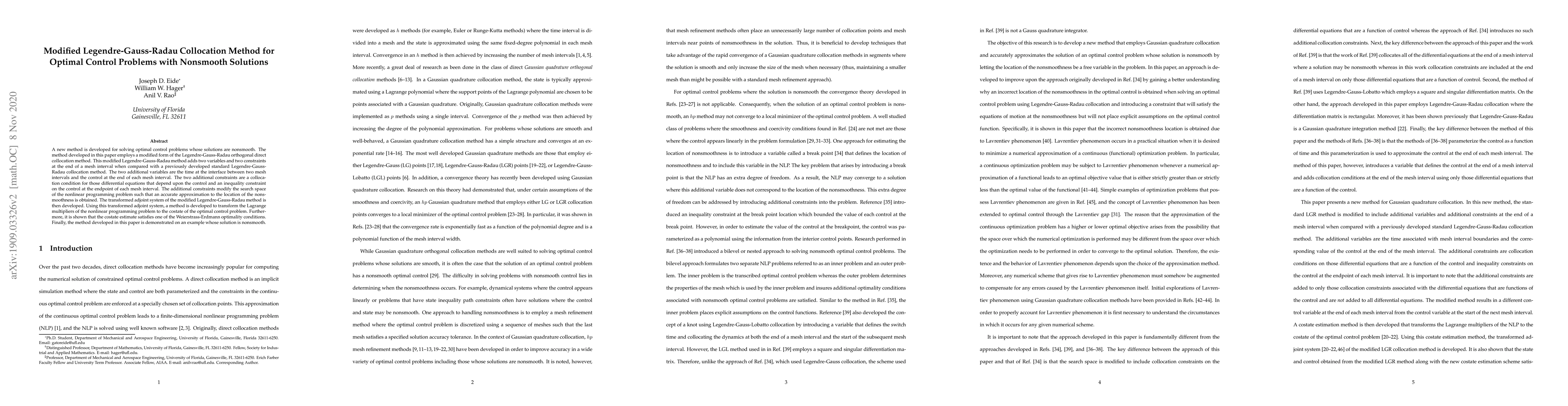 This paper introduces a modified Legendre-Gauss-Radau collocation method to solve optimal control problems with nonsmooth solutions by adding two variables and constraints per mesh interval. The method accurately approximates nonsmoothness and satisfies Weierstrass-Erdmann optimality conditions, demonstrated through an example.