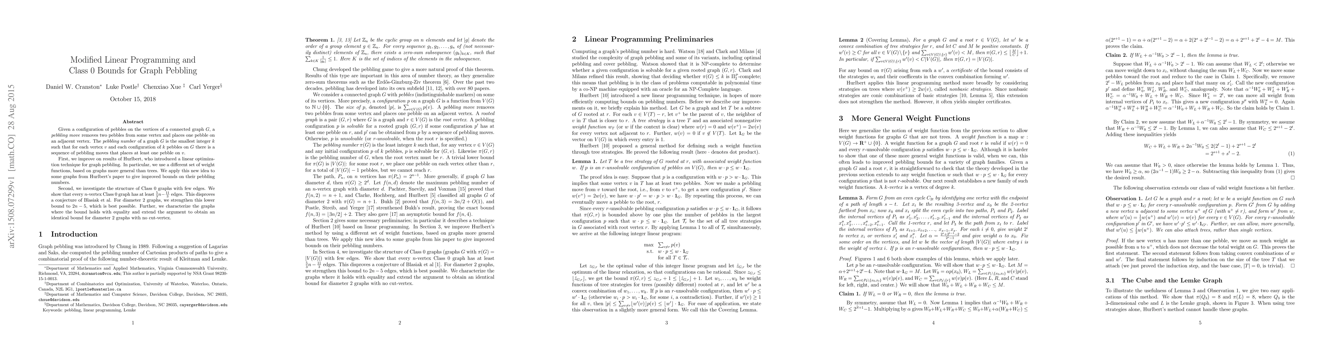 Given a configuration of pebbles on the vertices of a connected graph $G$, a \emph{pebbling move} removes two pebbles from some vertex and places one pebble on an adjacent vertex. The \emph{pebbling number} of a graph $G$ is the smallest integer $k$ such that for each vertex $v$ and each configuration of $k$ pebbles on $G$ there is a sequence of pebbling moves that places at least one pebble on $v$. First, we improve on results of Hurlbert, who introduced a linear optimization technique for graph pebbling. In particular, we use a different set of weight functions, based on graphs more general than trees. We apply this new idea to some graphs from Hurlbert's paper to give improved bounds on their pebbling numbers. Second, we investigate the structure of Class 0 graphs with few edges. We show that every $n$-vertex Class 0 graph has at least $\frac53n - \frac{11}3$ edges. This disproves a conjecture of Blasiak et al. For diameter 2 graphs, we strengthen this lower bound to $2n - 5$, which is best possible. Further, we characterize the graphs where the bound holds with equality and extend the argument to obtain an identical bound for diameter 2 graphs with no cut-vertex.