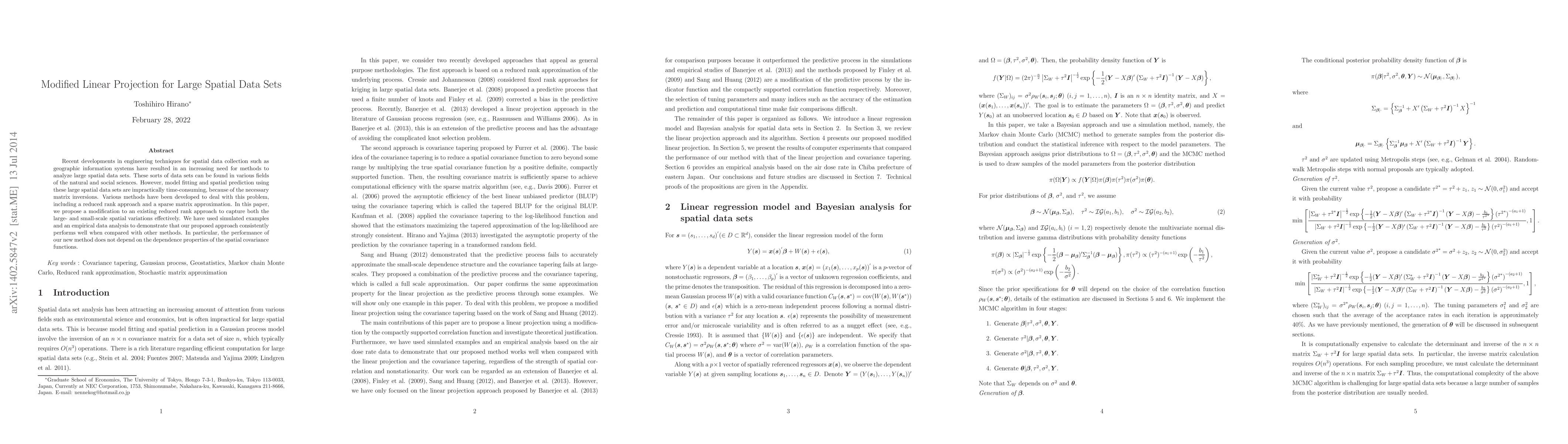 This paper proposes a modified linear projection method to efficiently analyze large spatial data sets, addressing the impracticality of traditional matrix inversions. The new approach effectively captures both large- and small-scale spatial variations and performs well across various simulated and empirical datasets, independent of spatial covariance properties.