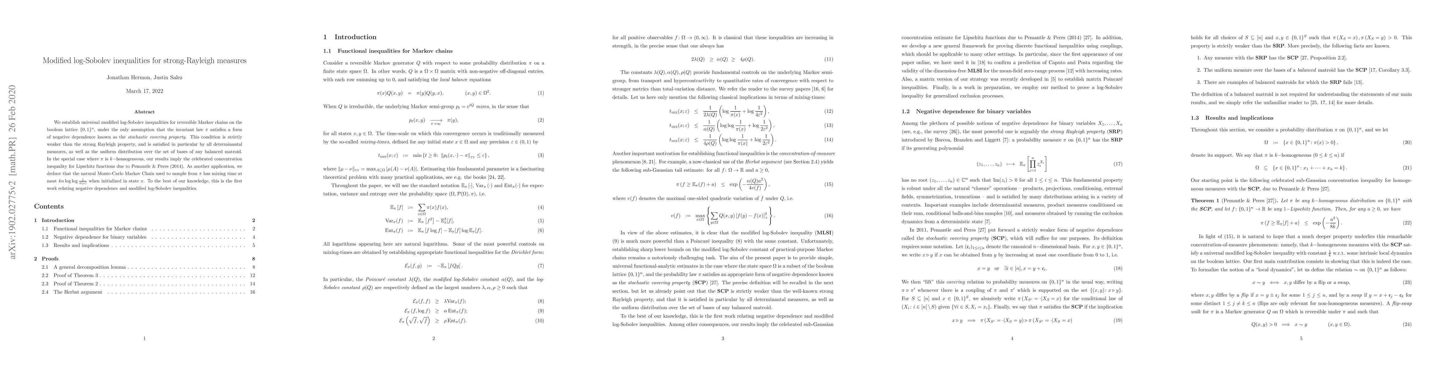 This paper establishes modified log-Sobolev inequalities for reversible Markov chains under the stochastic covering property, a weaker condition than the strong Rayleigh property, applicable to determinantal measures and product measures. It also provides a concentration inequality for Lipschitz functions and determines the mixing time for Monte-Carlo Markov Chains.