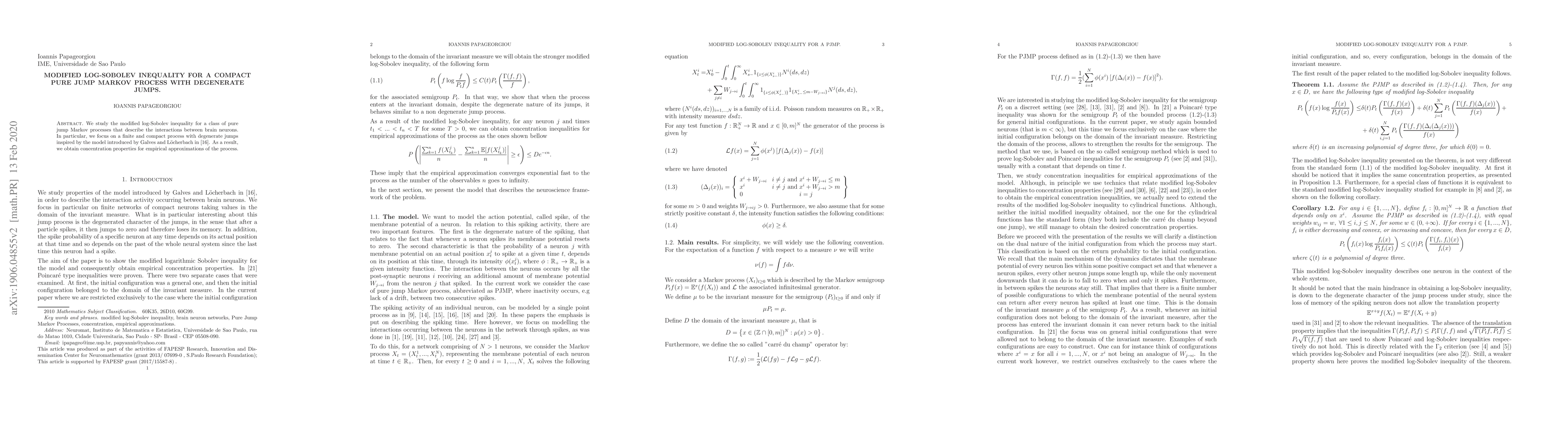 Researchers develop a modified log-Sobolev inequality for compact pure jump Markov processes modeling brain neuron interactions, leading to concentration properties for empirical approximations.